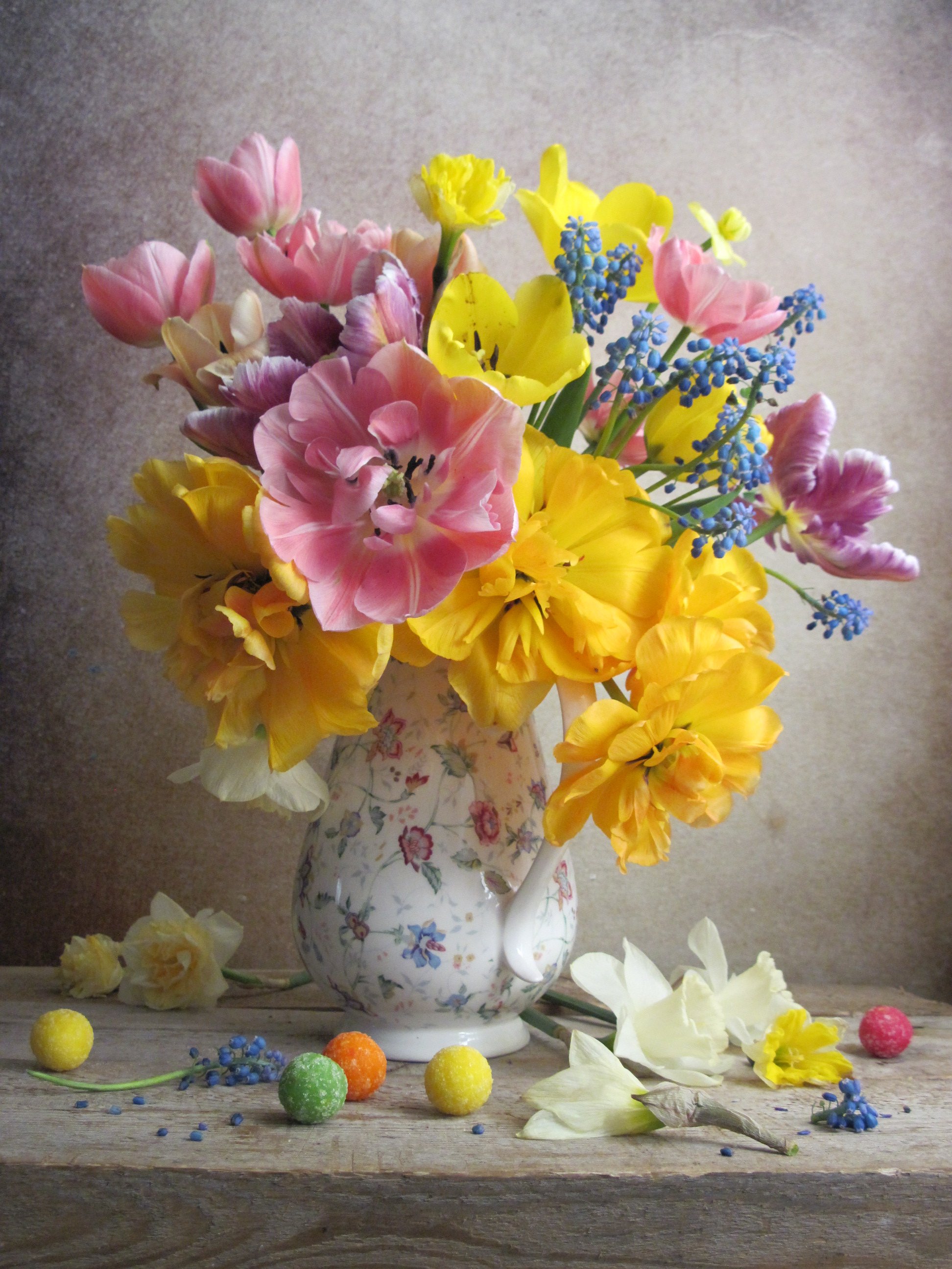 цветы, букет, тюльпаны, нарциссы, мускарики, кувшин, конфеты, Наталия Тихомирова