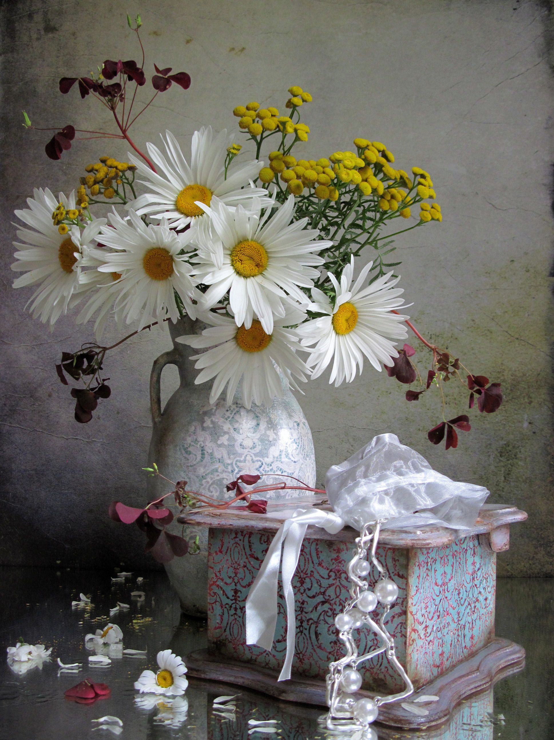 цветы, букет, ромашки, пижма, бусы, бижутерия,шкатулка, кувшин, винтаж, декупаж, Наталия Тихомирова