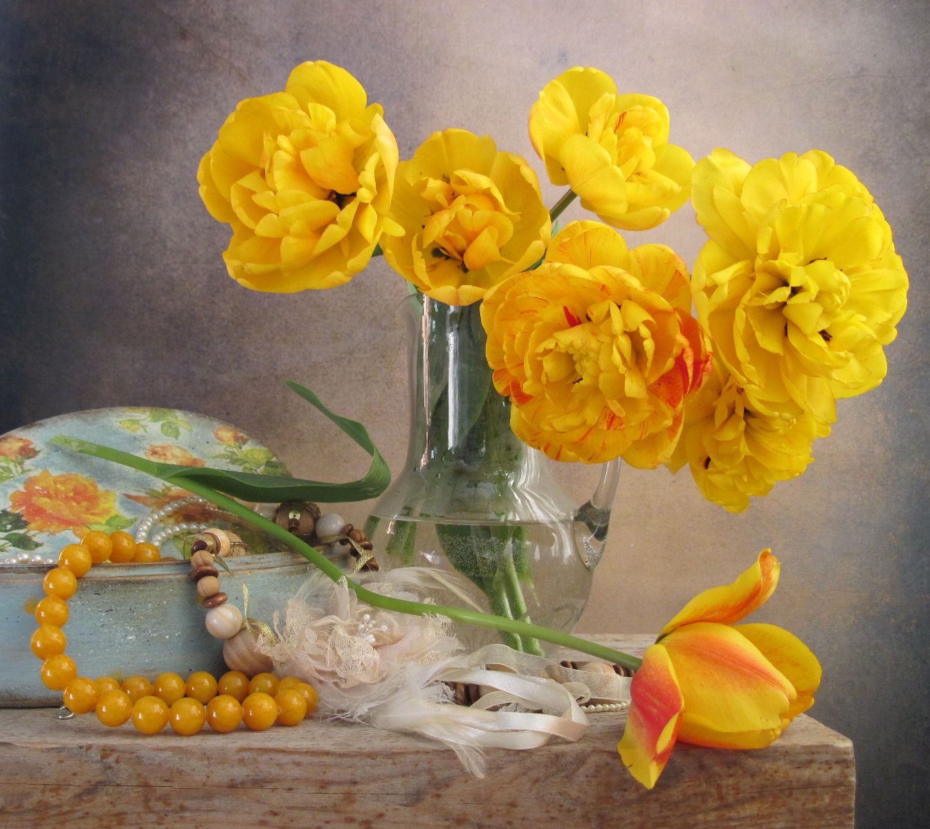 цветы. букет, тюльпаны, бусы, бижутерия, шкатулка, кувшин, желтый цвет, Наталия Тихомирова