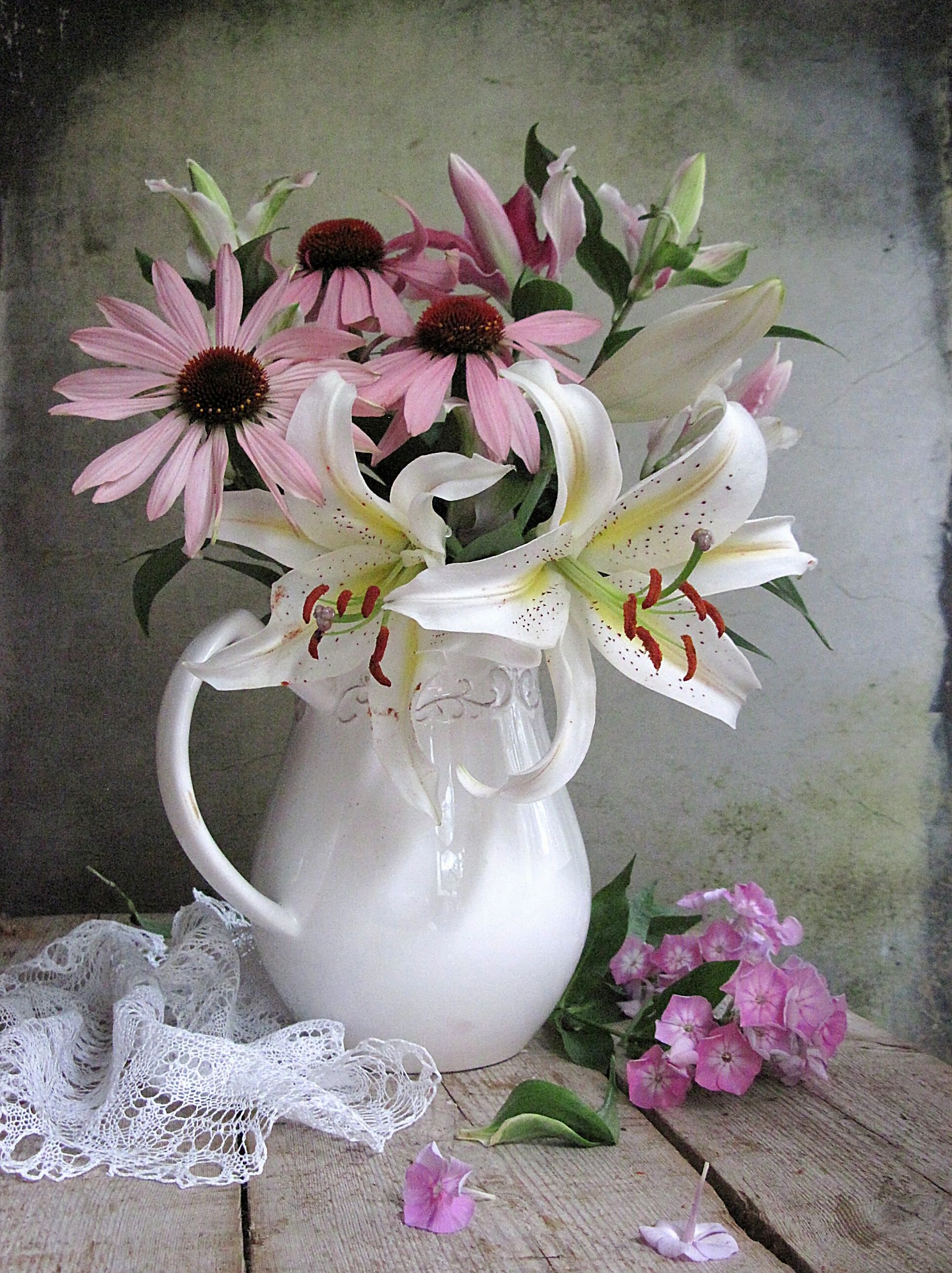 цветы, букет, лилии, гвоздика, эхинацея, кувшин,керамика. салфетка, Наталия Тихомирова