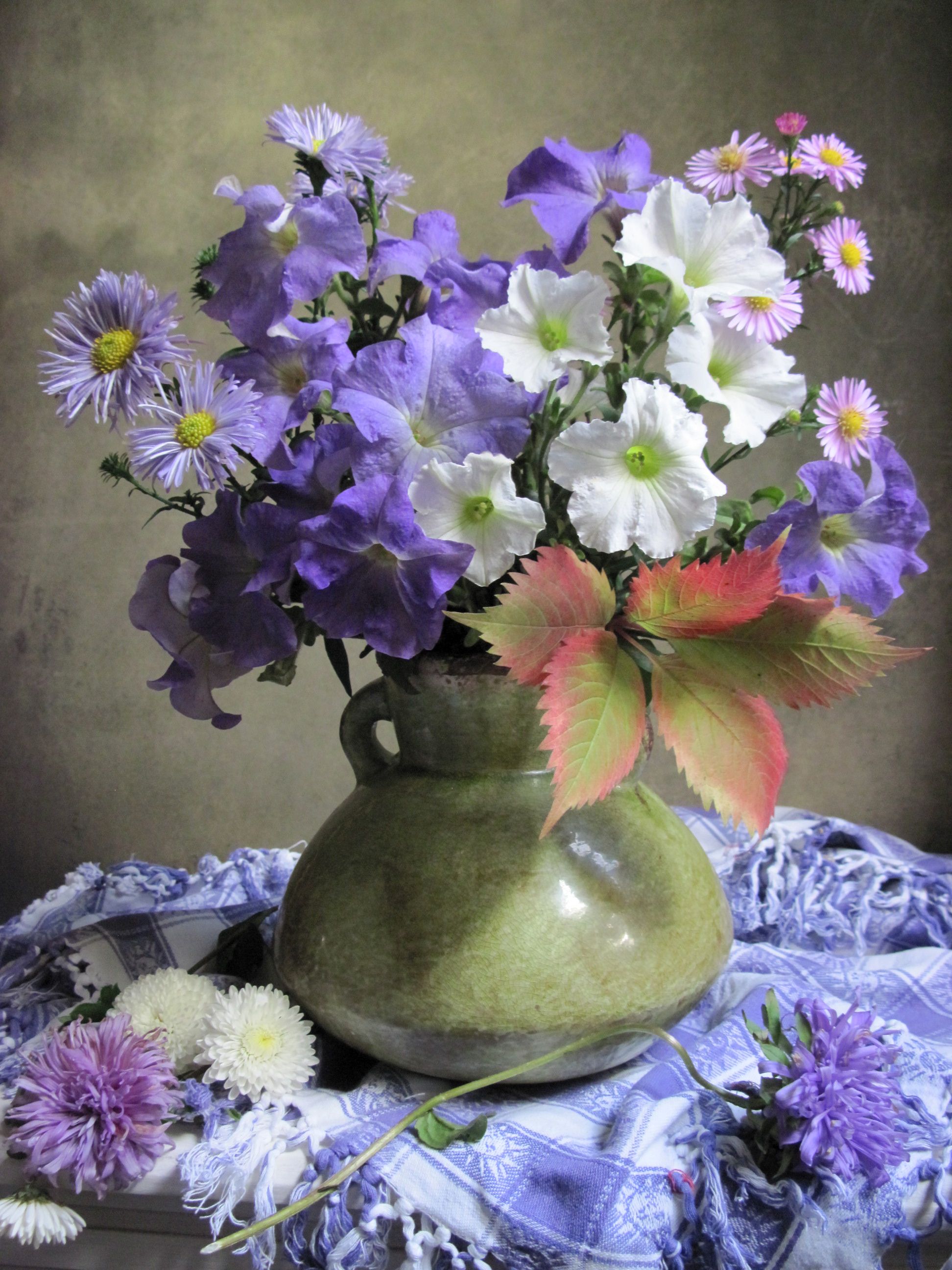 цветы, букет, петунии, хризантемы, лист, ваза, скатерть, Наталия Тихомирова