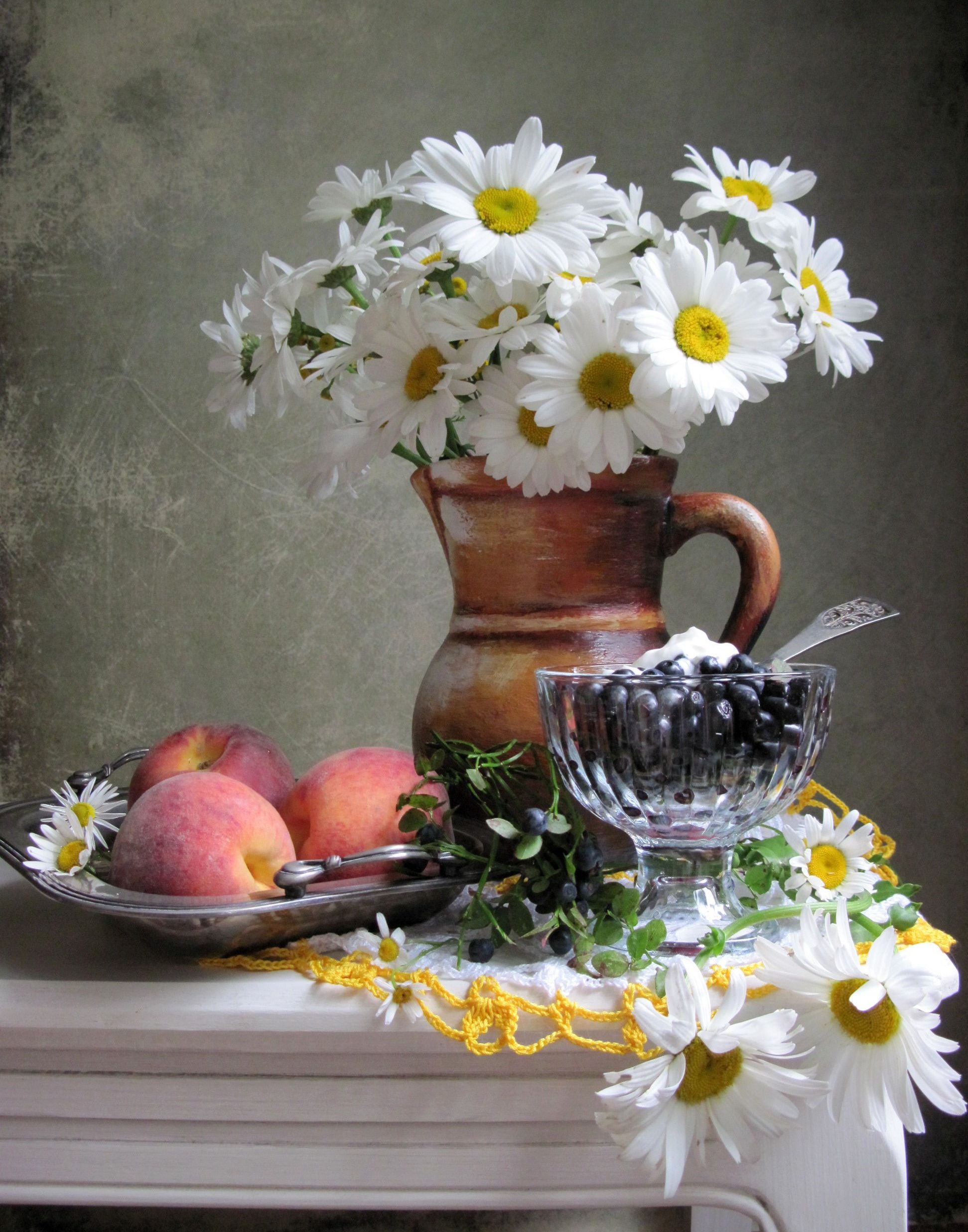 цветы, букет, ромашки, черника, персики, кувшин, креманка, поднос, салфетка, Наталия Тихомирова