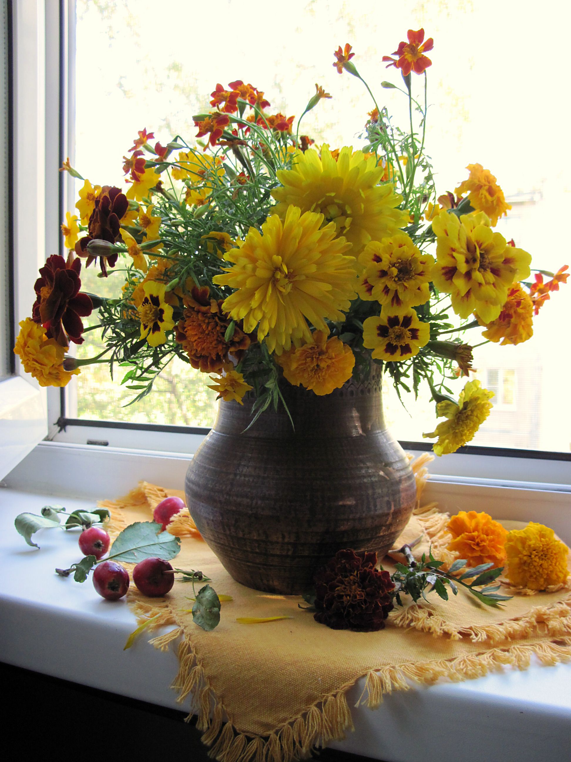 цветы, букет, бархатцы, ноготки, календула, желтый цвет, кувшин, салфетка, Наталия Тихомирова