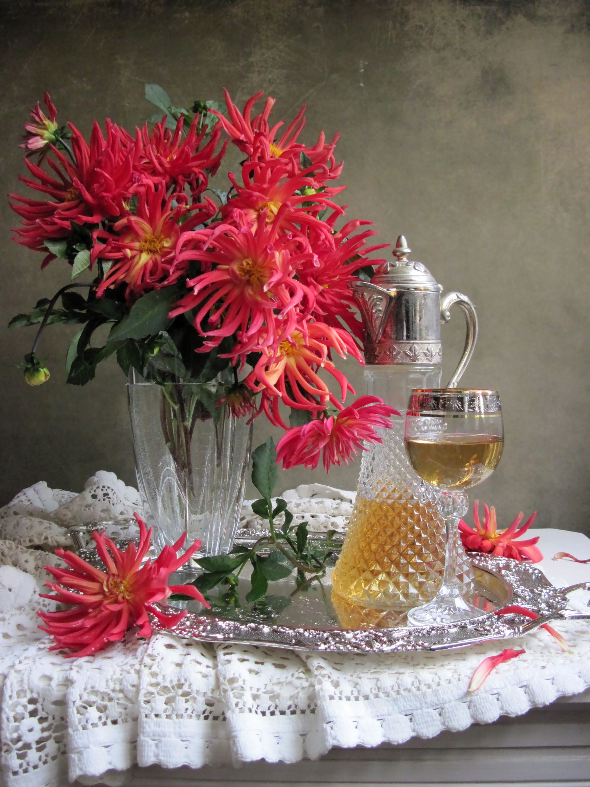 цветы, букет, георгины, поднос, декантер, рюмка, салфетка, Наталия Тихомирова