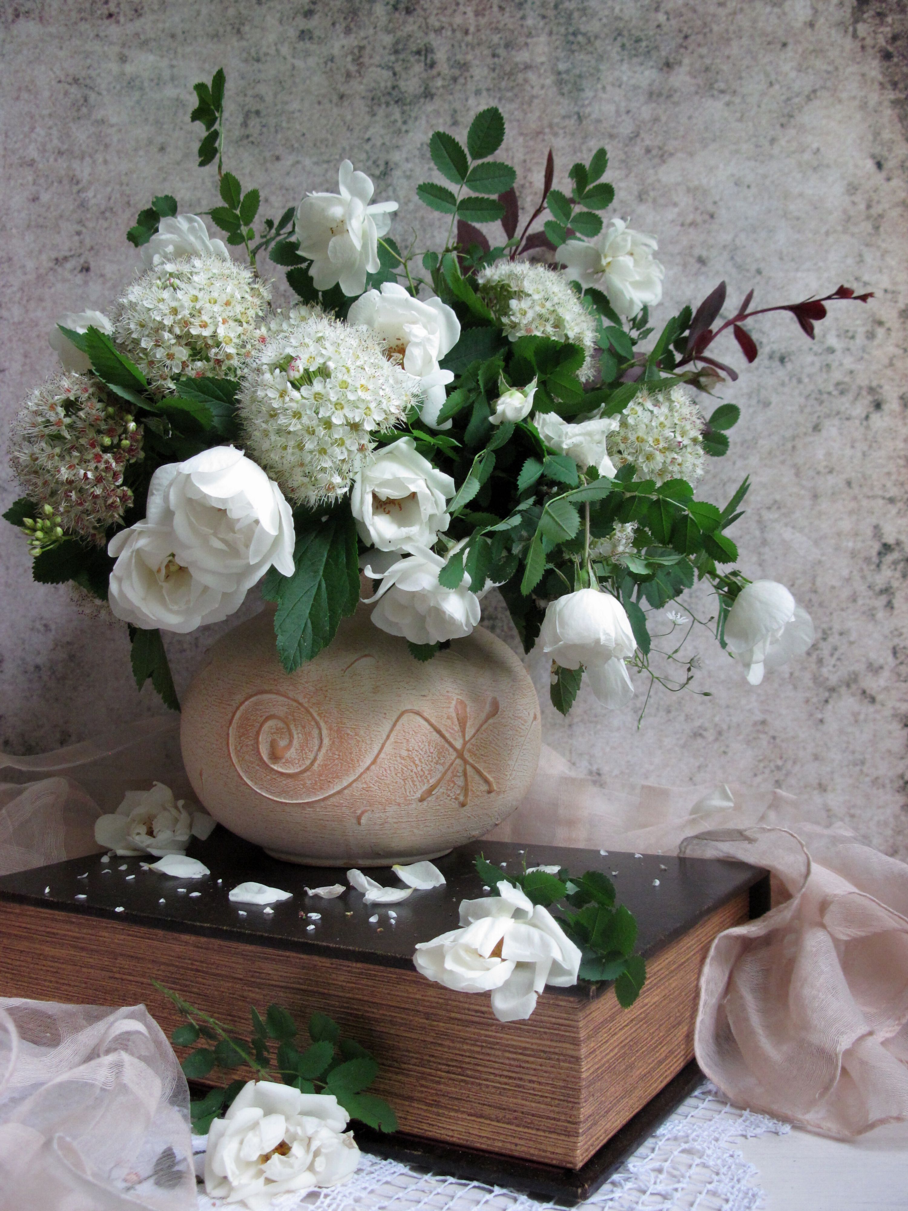 цветы, букет, розы, белый цвет, ваза, керамика, книга, шарф, Наталия Тихомирова