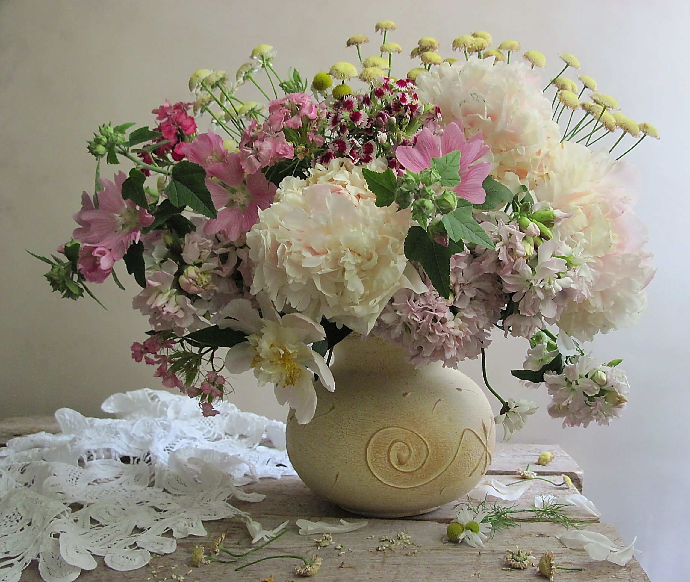 цветы, букет, пионы, гвоздика, мыльнянка, хризантема, лаватера, ваза, керамика, салфетка, ришелье, Наталия Тихомирова