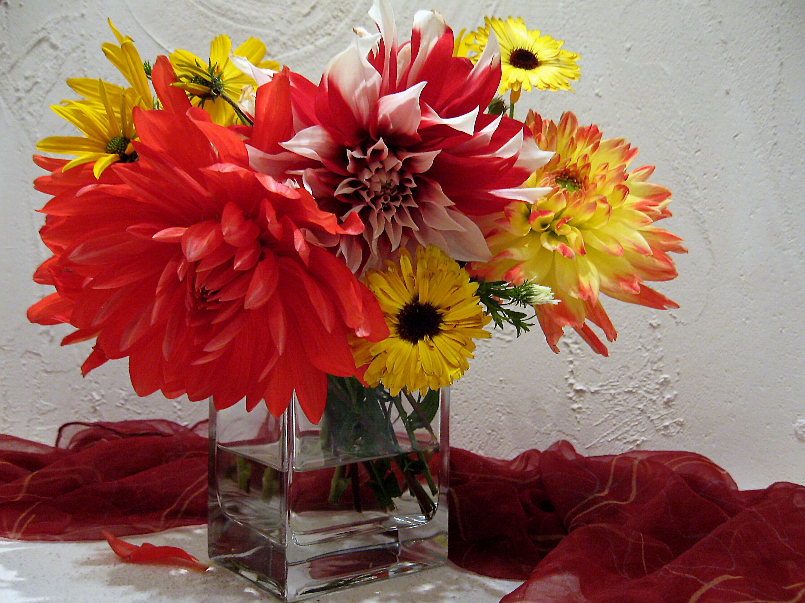 цветы, букет, георгины, ноготки, календула, ваза, стекло, шарф, Наталия Тихомирова