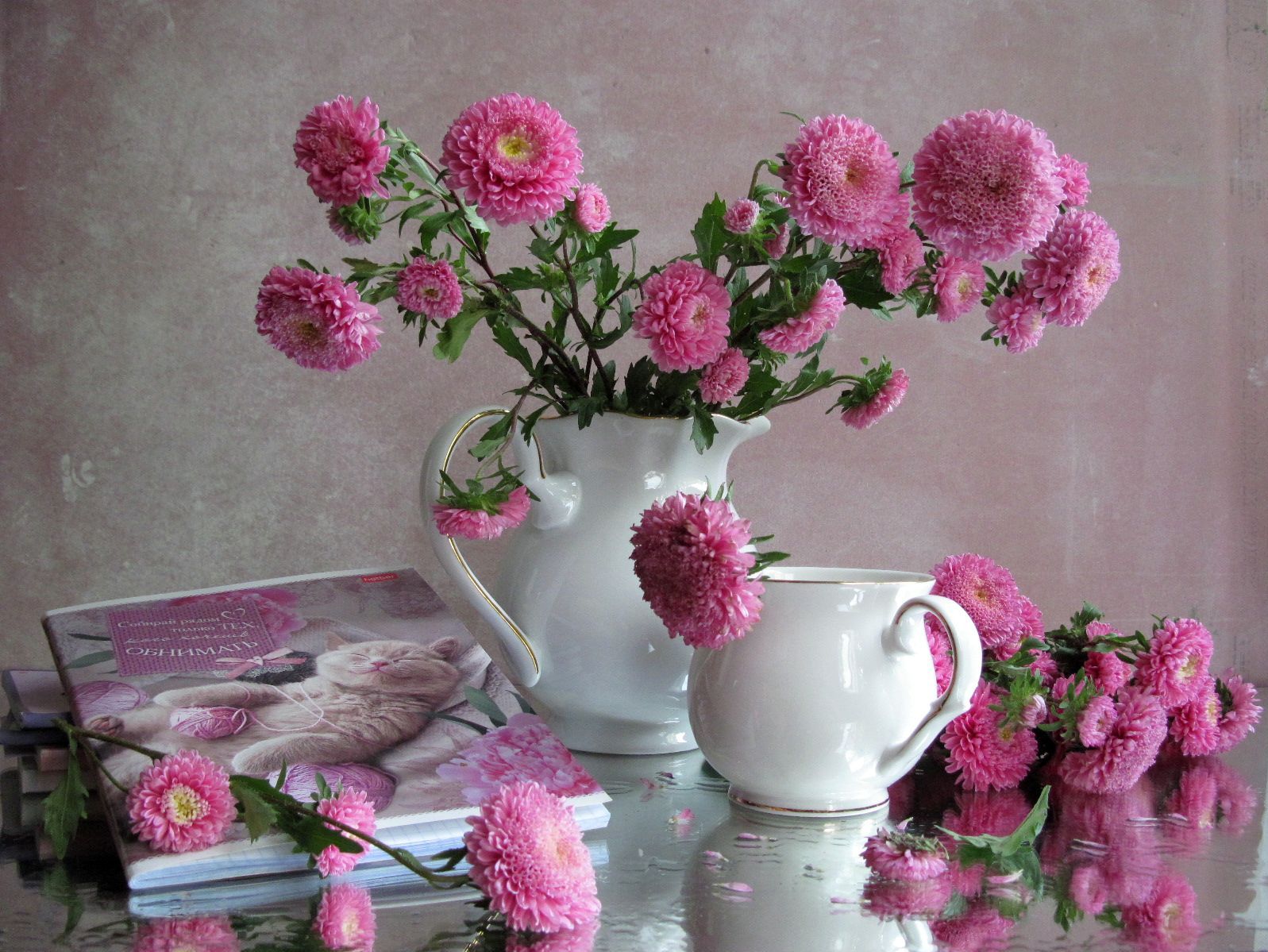 цветы, букет, астры, кувшин, кружка, тетради, Наталия Тихомирова