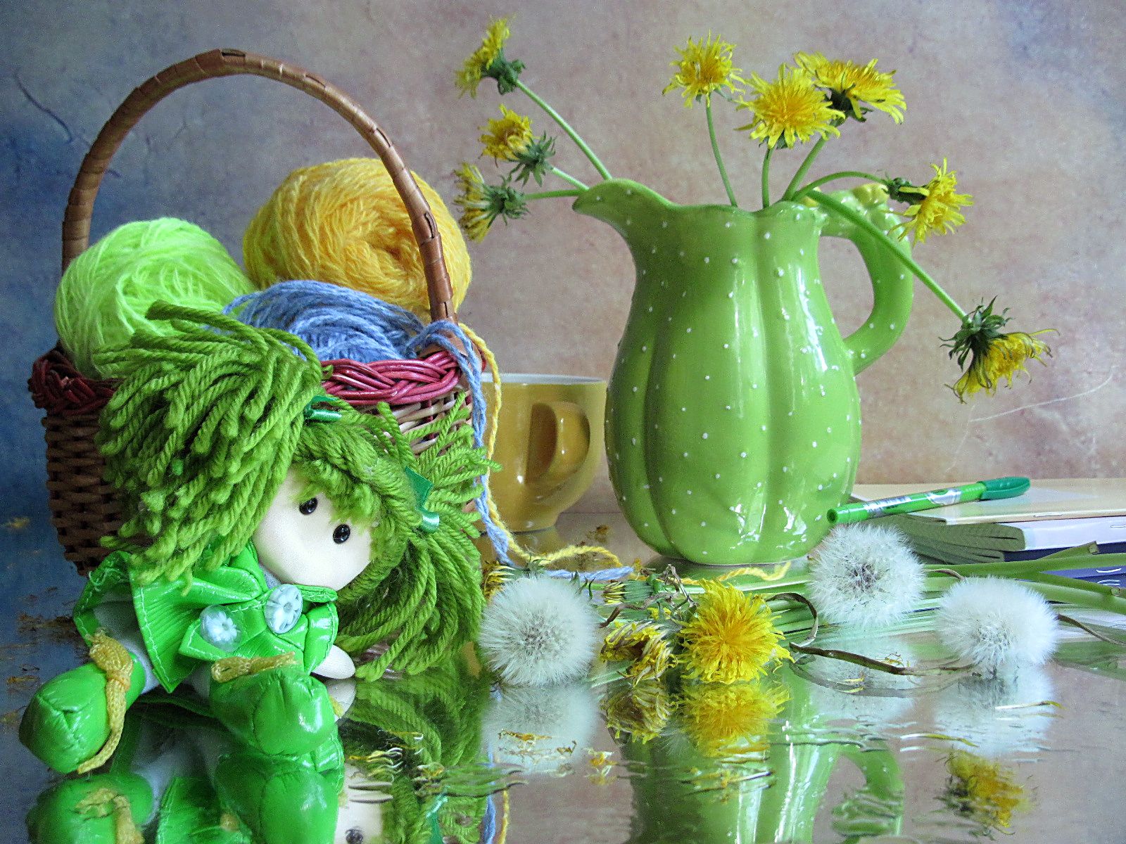 цветы, букет, одуванчики, кувшин, кружка, корзинка, пряжа, кукла, тетради, ручка, Наталия Тихомирова