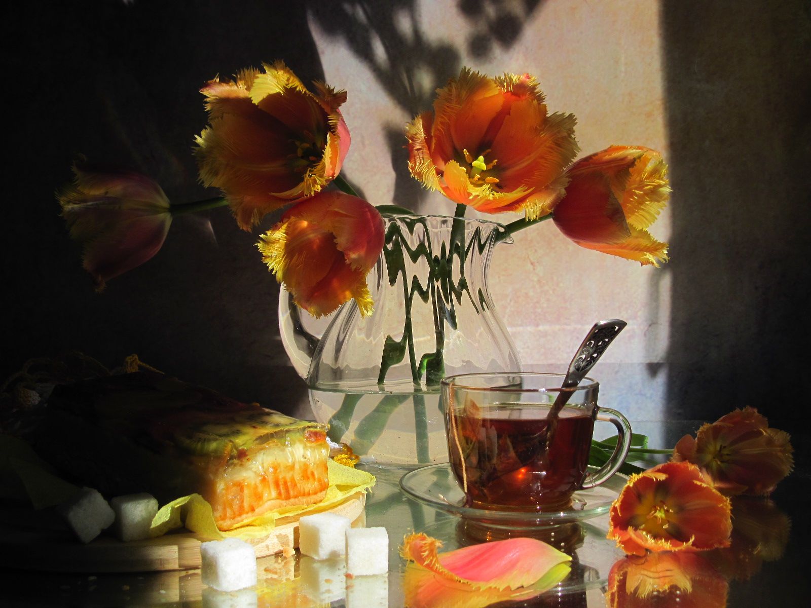 цветы, букет, тюльпаны, десерт, чай, кувшин, чайная пара, кухонная доска, салфетки, сахар, Наталия Тихомирова