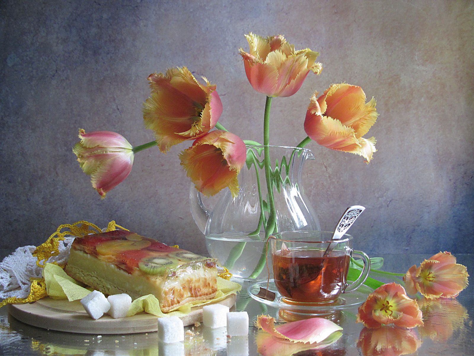цветы, букет, тюльпаны, десерт, чизкейк, кувшин, чайная пара, кухонная доска, салфетки, сахар, Наталия Тихомирова