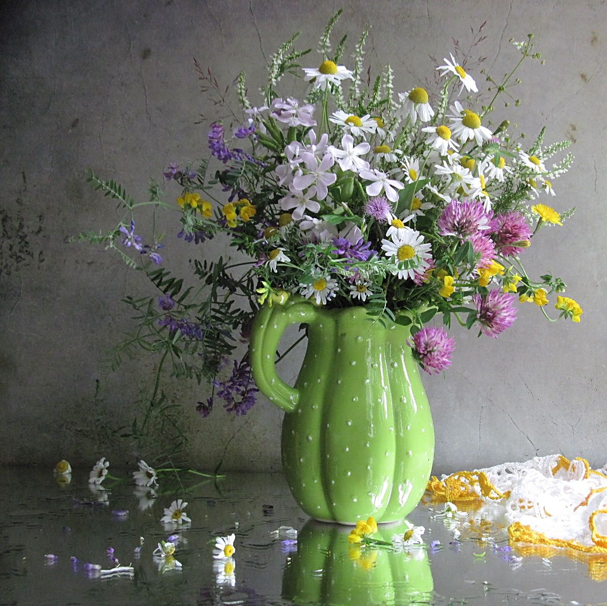 цветы, букет, полевые цветы, ромашки, клевер, мышиный горошек, кувшин, салфетка, Наталия Тихомирова
