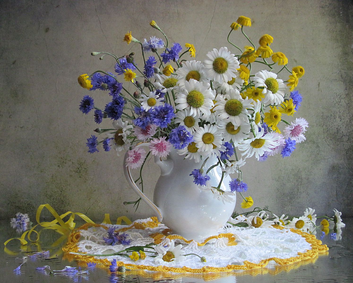 цветы, букет, васильки, ромашки, салфетка, лента, Наталия Тихомирова