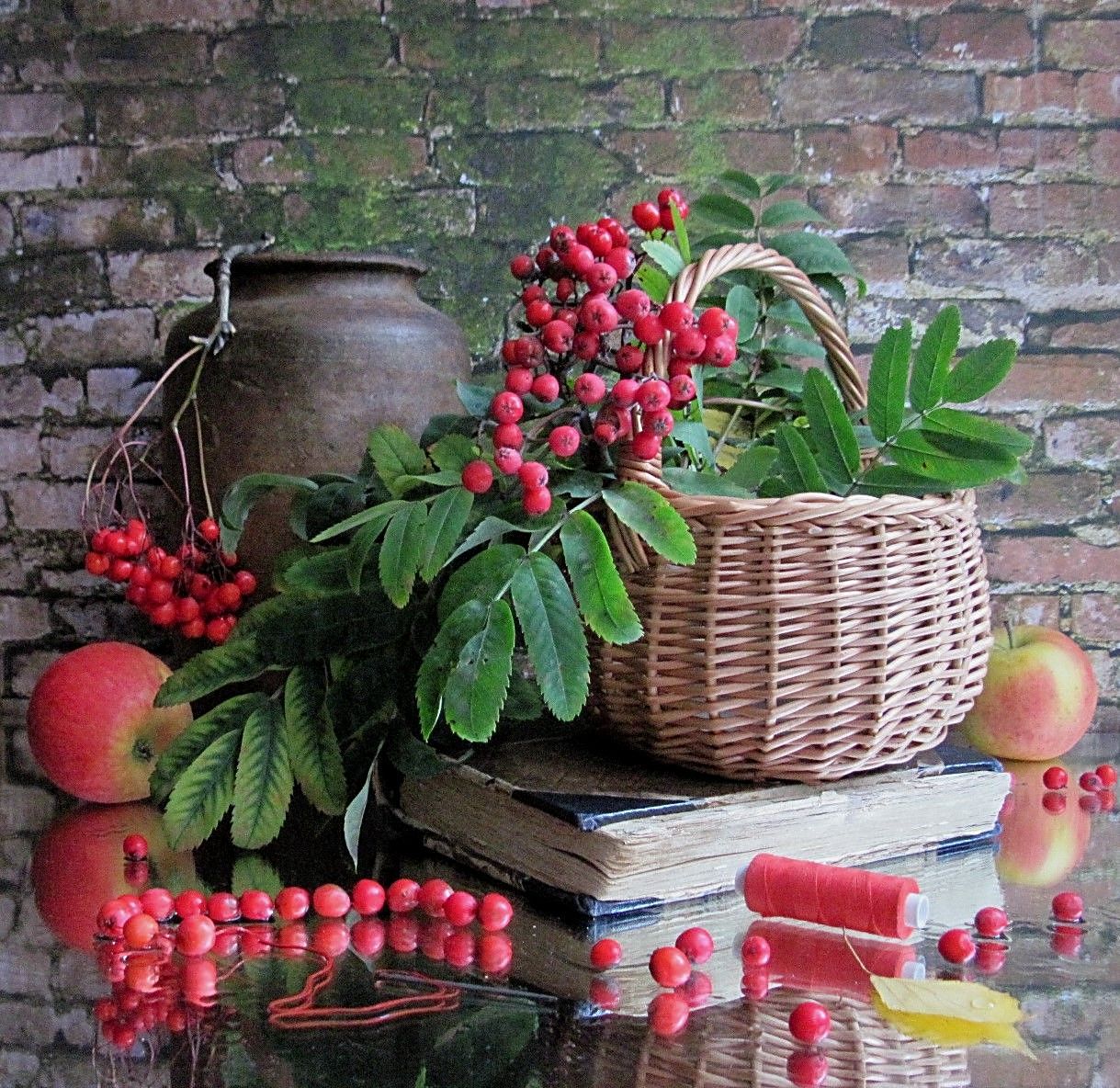 ветки, рябина, яблоки, корзина, ваза, книга, нитки, иголка, рябиновые бусы, Наталия Тихомирова