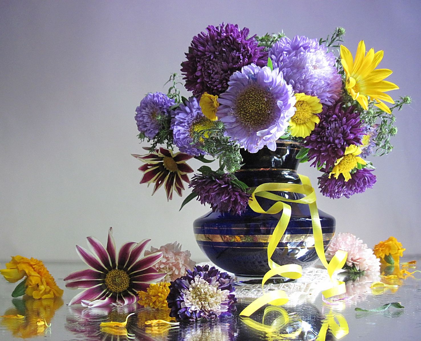 цветы, букет, астры, бархатцы, газания, ваза, цветное сиекло, лента, Наталия Тихомирова