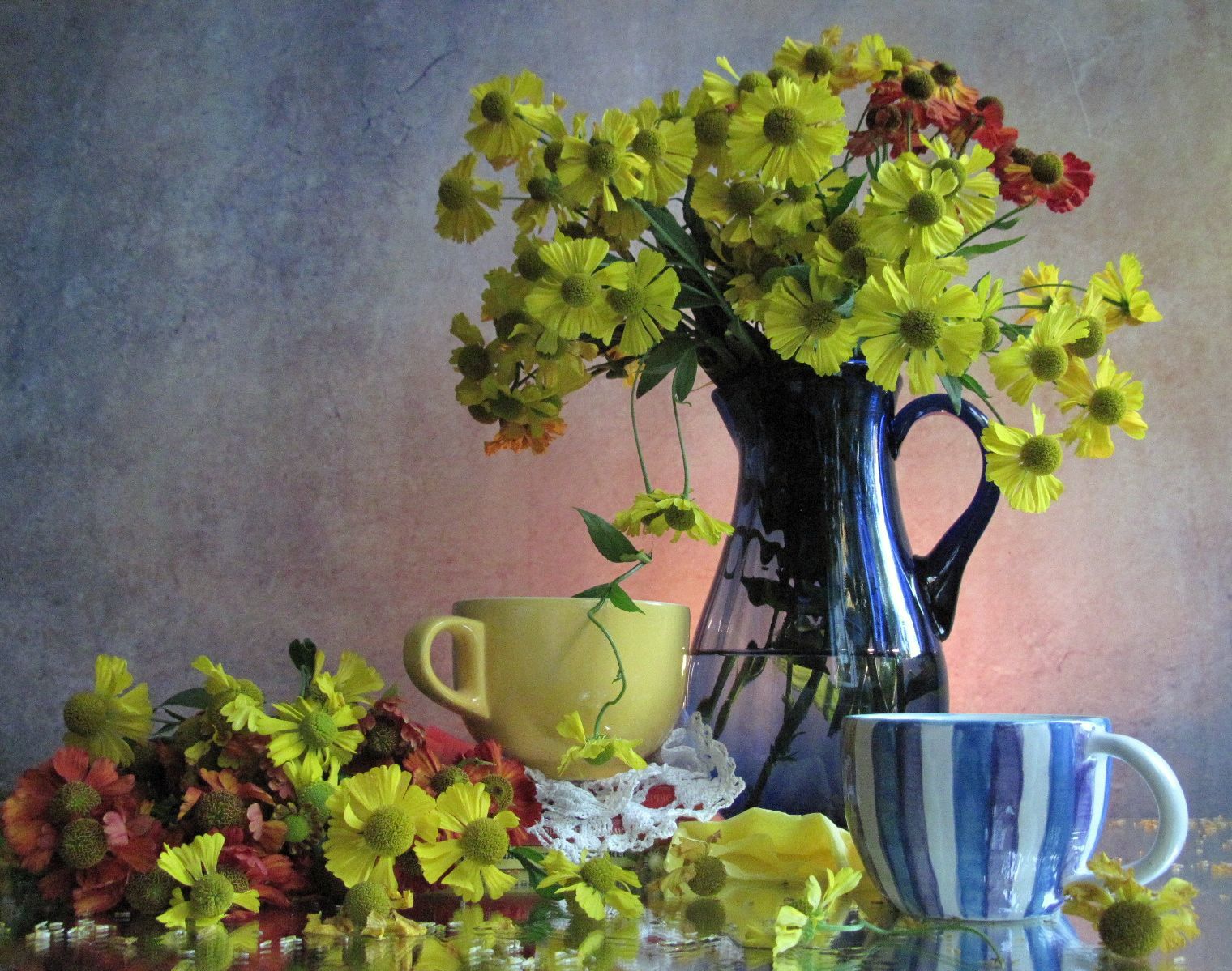 гелениум, кувшин, стекло, кружки, керамика, Наталия Тихомирова