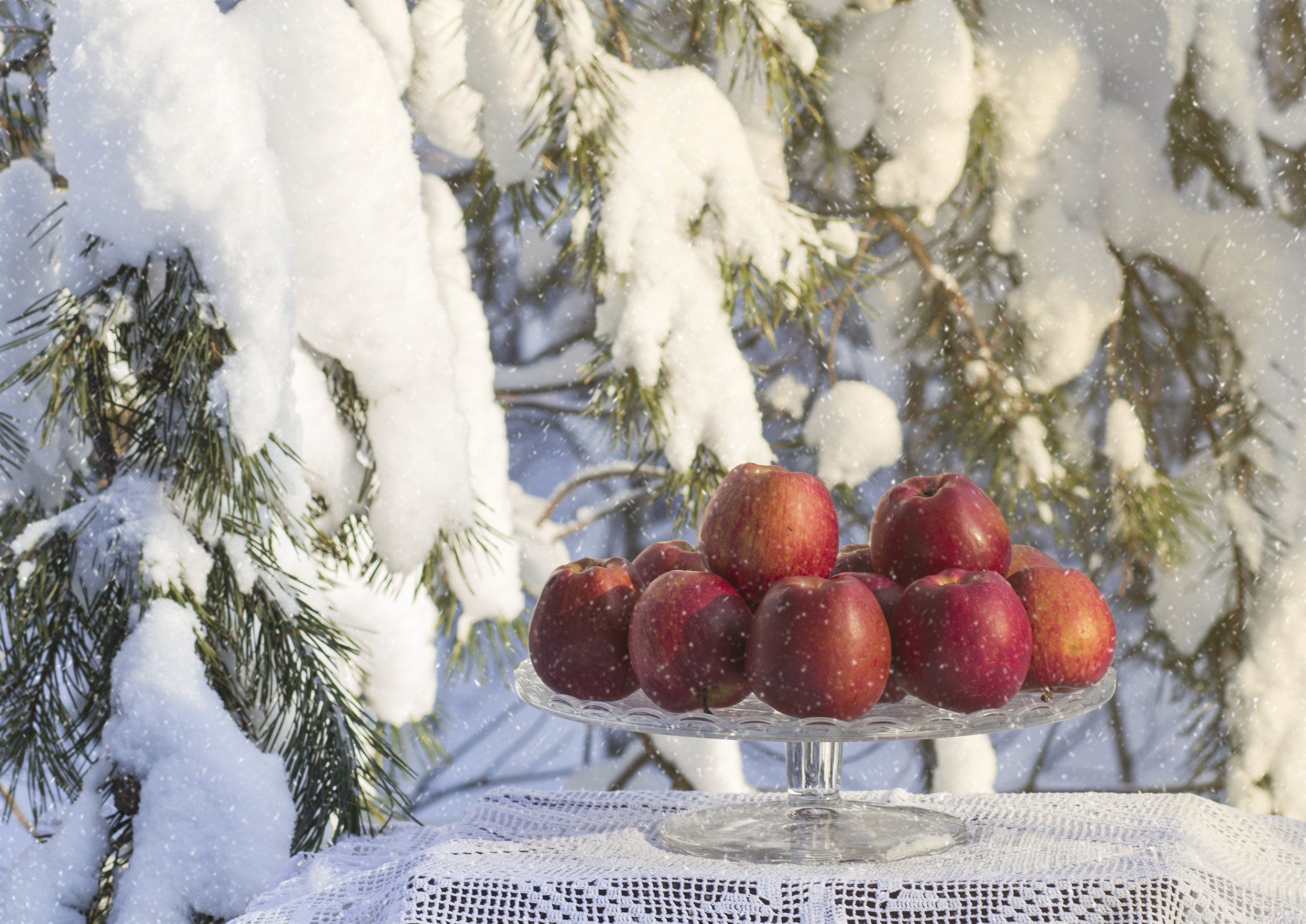 Ваза, Елки, Ель, Зима, Зимний, Красные, Лес, Скатерть, Снег, Снегопад, Стеклянная, Сугробы, Яблоки, Наталья Бочкарева