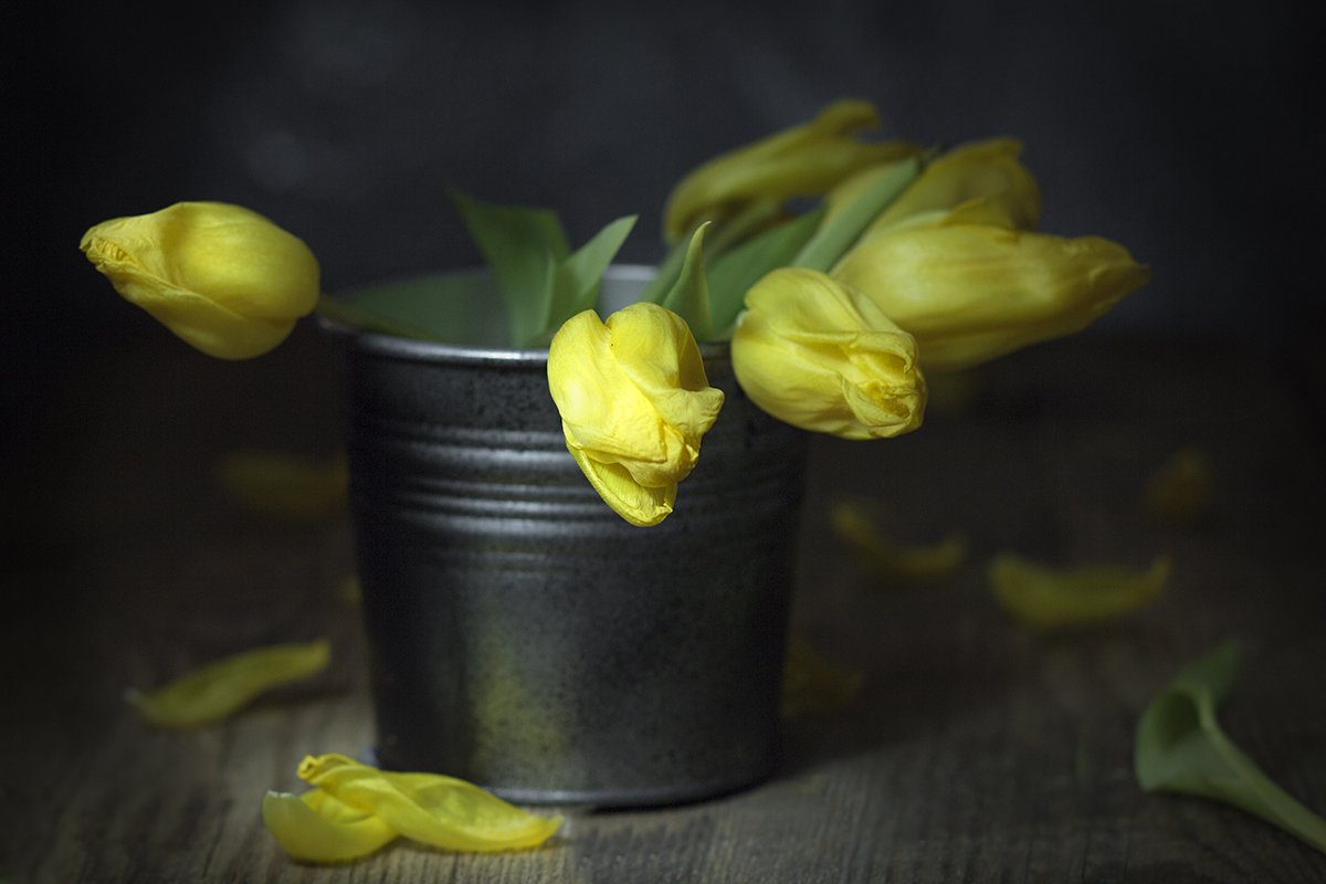 натюрморт, цветы, желтые тюльпаны, маленькое ведерко, винтаж, деревенский стиль, букет тюльпанов, Наталья Бочкарева
