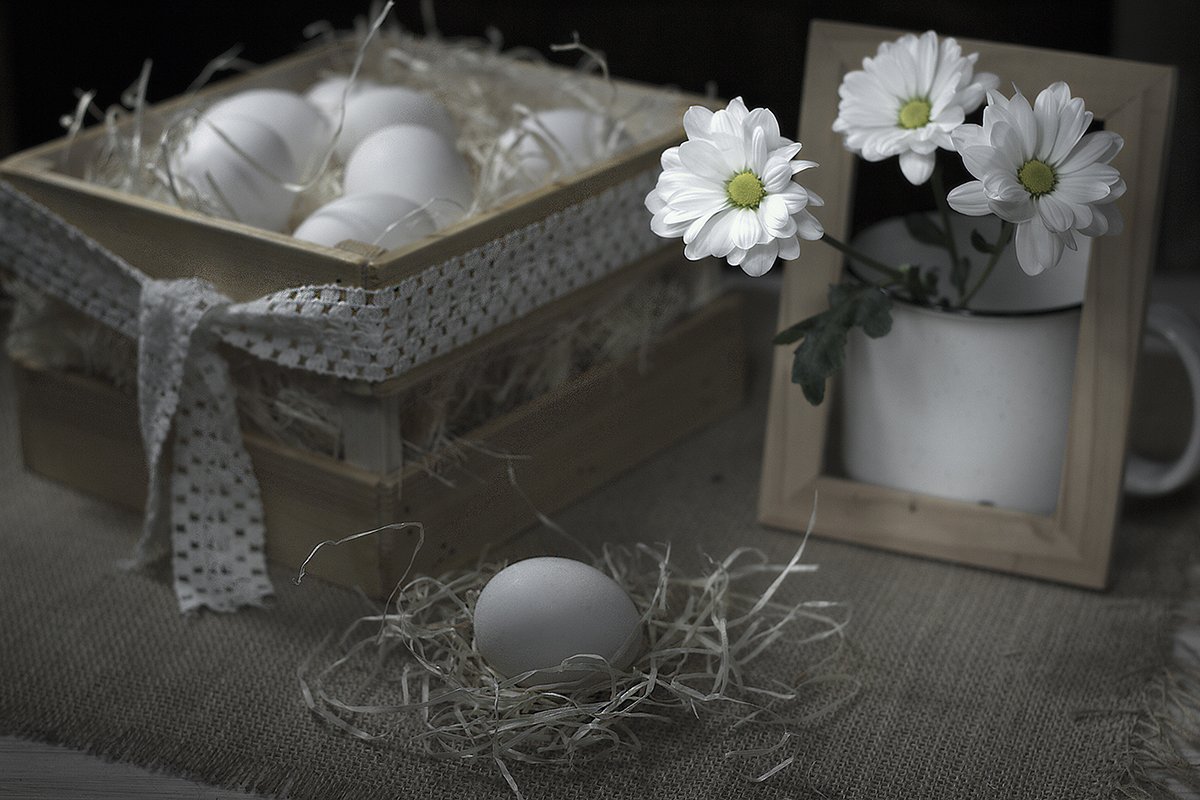 яйца, ромашки, белая кружка, рамка для фотографий, деревянный ящик, натюрморт, цветы, солома, деревенский стиль, Наталья Бочкарева