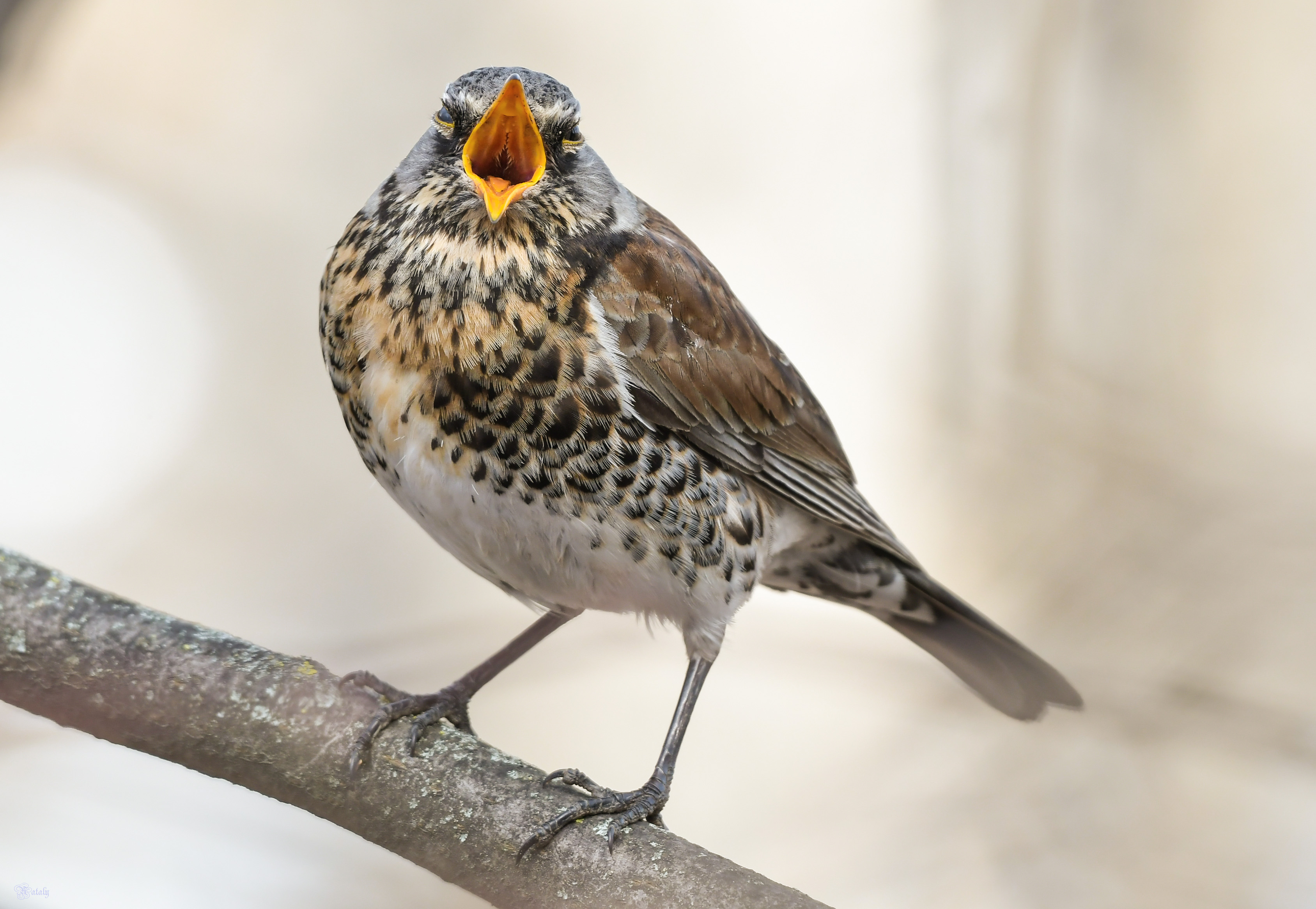 Наталья, дрозд-рябинник снят с ясной детализацией оперения и выразительным кадром — птица в полном раскрытии голоса, фон нейтрален, фокус точен. 🐦 Какой момент в поведении птицы Вы хотели зафиксировать?