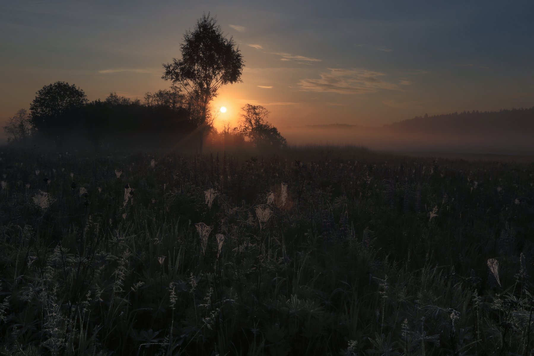 Рассвет. Роса на паутинке