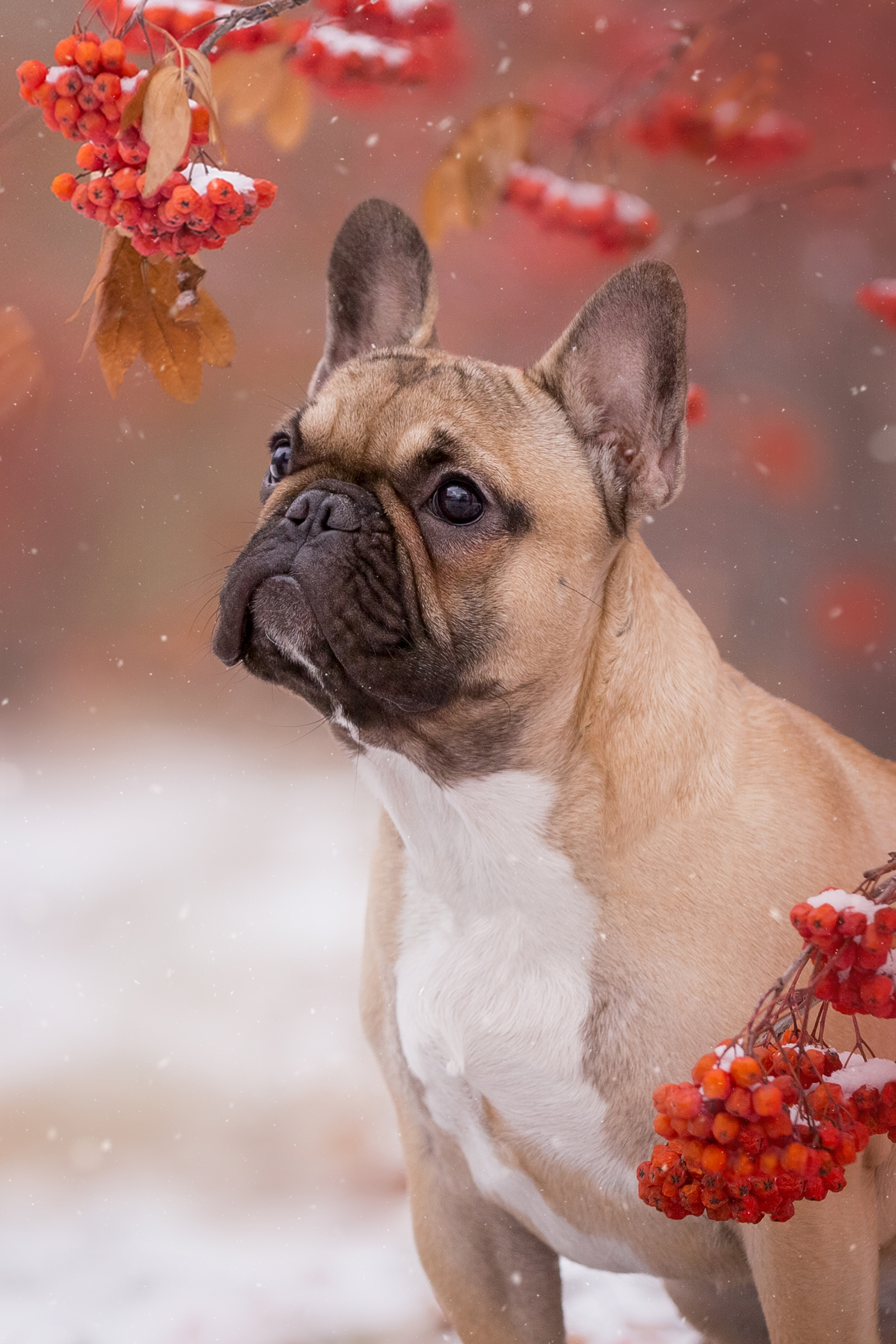 Кадр снят в холодной, но живой атмосфере — собака выглядит выразительно, фон мягко размыт, красные ягоды контрастируют с снегом и шерстью. Композиция удачная, свет естественный. Могло бы быть чуть больше глубины в фокусе, но в целом — хороший портрет.