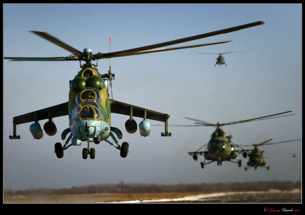 Казахстан. Авиабаза Учарал. Групповой взлет трех типов боевых вертолетов, стоящих на вооружении Сил воздушной обороны РК. На первом плане "Ми-24", за ним "Ми-8 МТВ", далее "Ми-171". Проход над полосой совершают "Ми-171", и еще один "Ми-24".