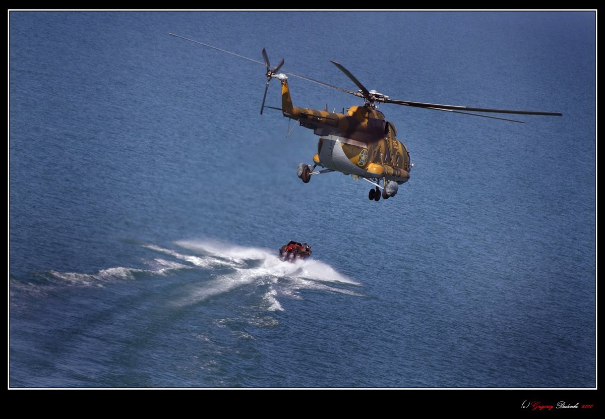 Вертолет "Ми-8 МТВ" казахстанской береговой охраны преследует дагестанских браконьеров в акватории Каспия. Ситуация с браконьерством на Каспийском море просто катастрофическая. Здесь обитают уникальные породы осетровых, которых варварски уничтожают. В казахстанских территориальных водах практически ежедневно фиксируются случаи незаконного вторжения граждан соседней России (Дагестан, Калмыкия, Ингушетия), Азербайджана, даже Туркменистана. Браконьеры, преимущественно перемещаются на так называемых "байдах" мощных моторных лодках, которые на воде развивают скорость до 140-ка километров в час. Догнать их можно только с помощью вертолета.