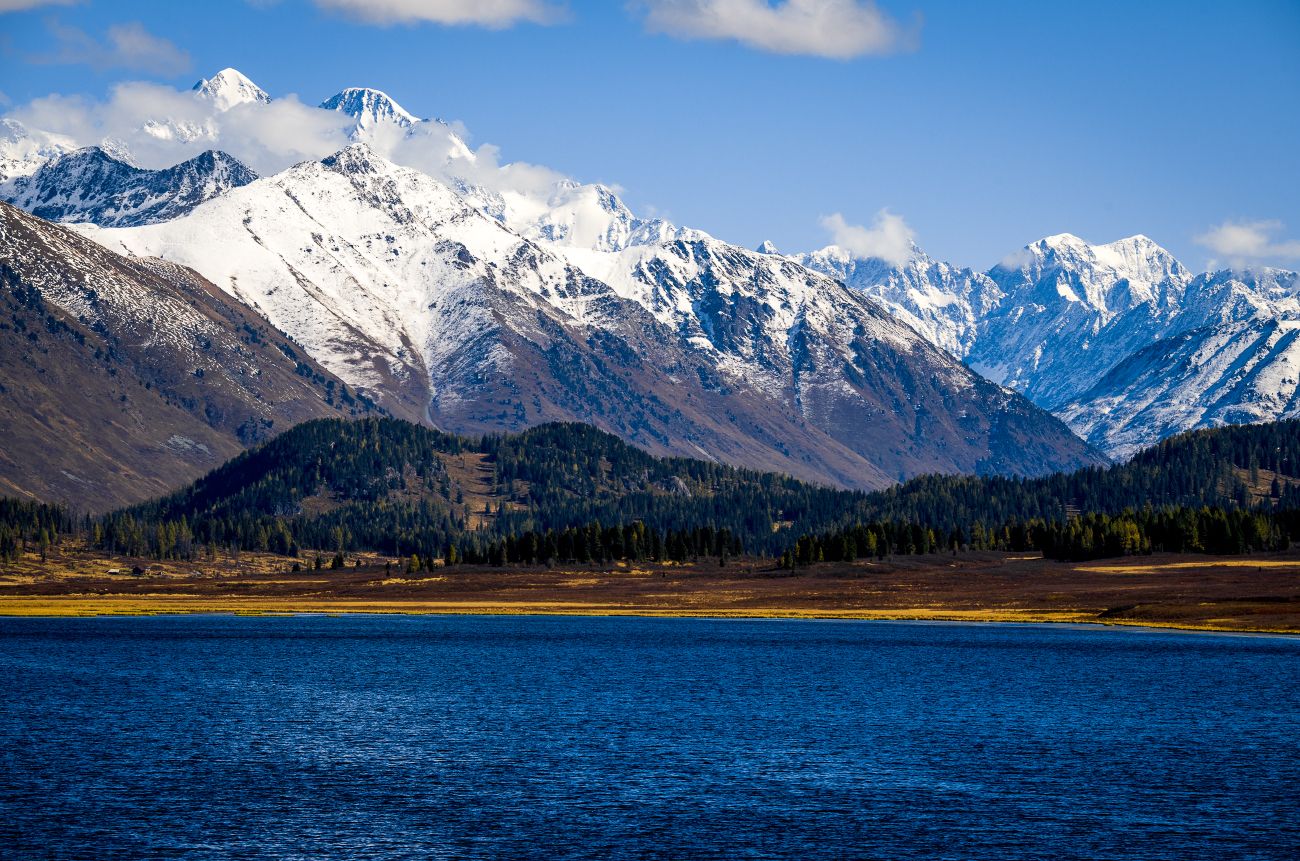 Казахстанская часть Алтая. Озеро Язевое и гора Белуха, высочайшая вершина Алтайской горной системы (4506 метров над уровнем моря). Снято в сентябре 2022-го года.