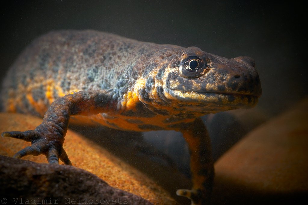 В контролируемых условиях - в аквариуме. Нашел этого редкого зверя (Красная книга Краснодарского края) во время перекладывания штабеля кирпичей на заднем дворе. В сухопутном состоянии тритон не так эффектен, как под водой. После съемки животное было с почестями отпущено на свободу.