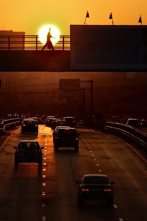 )))... Пришлось подождать).. я знал, что солнце будет в этом месте в 21.30 - я за день до этого пролетал по ленинградке. Так что пришёл специально к назначенному времени - как на спектакль. А человека на мосту поймать - уже не так сложно)...