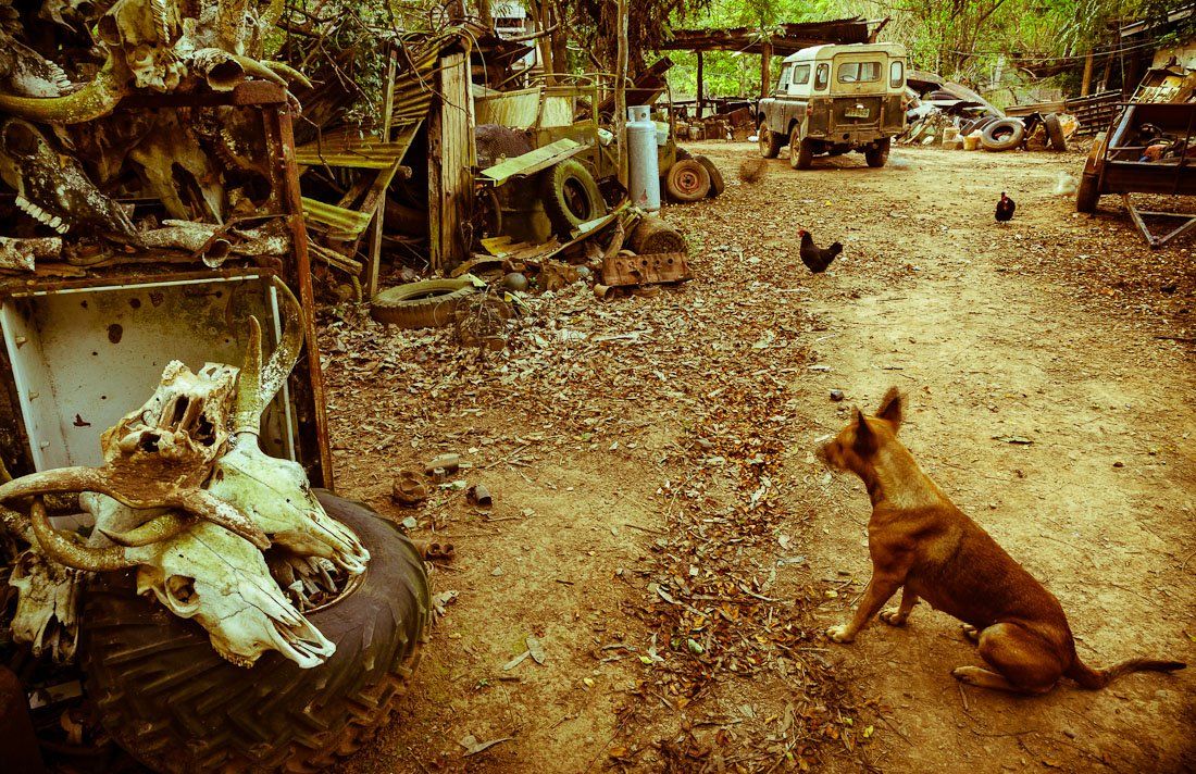 Постоянного электричества нет, рисует под лампой от батареи этого ландровера (49го года)