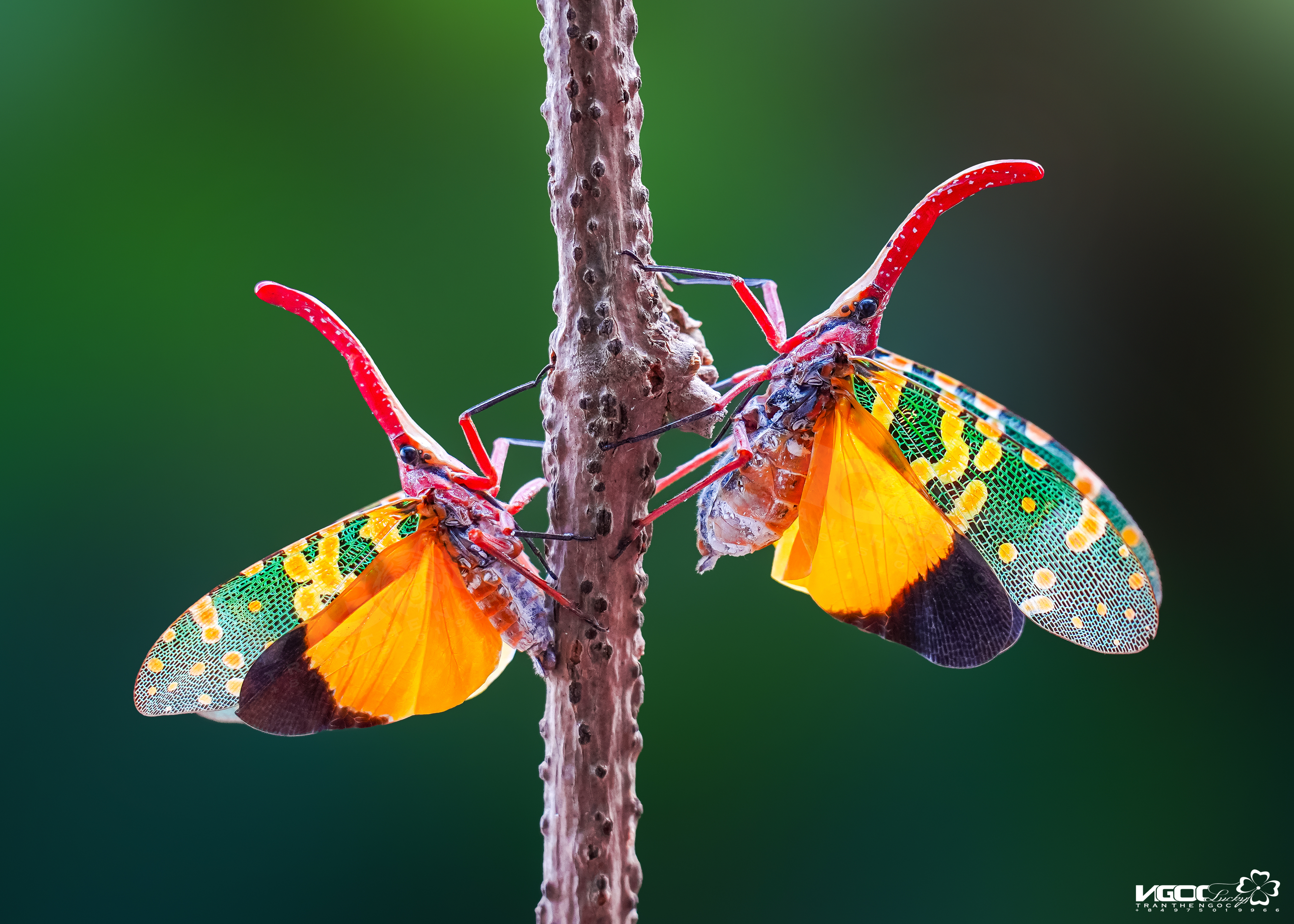 На фоне размытой зелени ветка становится сценой для удивительного дуэта — двух ярких насекомых, возможно, светляков-фонариков, чьи крылья переливаются оранжевым, зелёным и чёрным. Их длинные красные рога, как акценты, подчёркивают изящество. Снимок, сделанный Tran The Ngoc, захватывает мгновение, когда природа демонстрирует свою художественную грань — симметрию, цвет и тонкую динамику. Это не просто фото, а микрокосмос, где каждый элемент — часть сложной, но гармоничной композиции.
