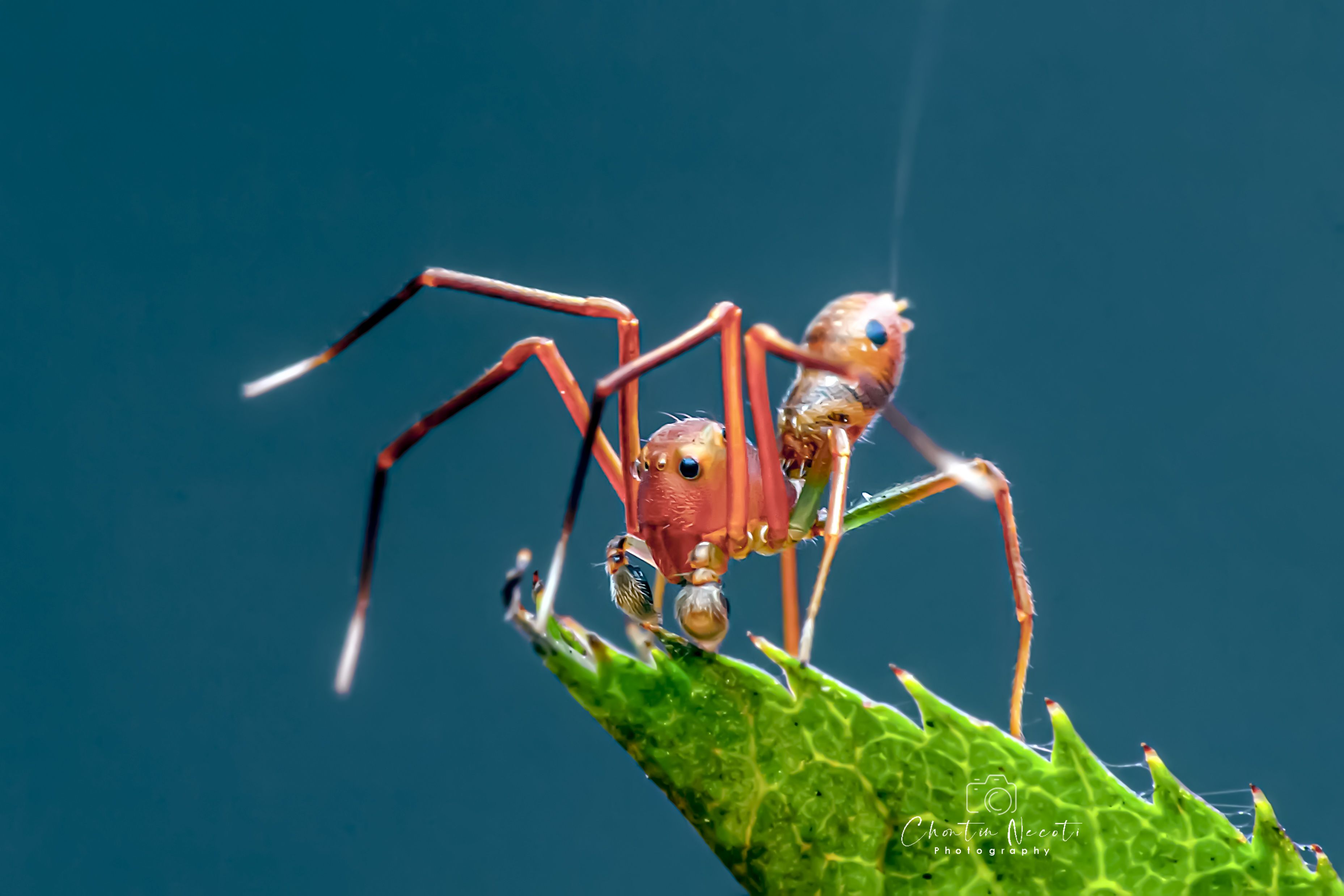 Spiders in this genus are generally around 5mm in length. They don't have the typical leg position or strong distinction between fore and hind legs typical of thomisids, instead holding the front two legs in the air to mimic antennae. The abdomen bears two dark spots which resemble the compound eyes of Weaver ants. Despite the "antennae" and "eyes" being on opposite sides of the body, the camouflage is effective enough to fool surrounding animals