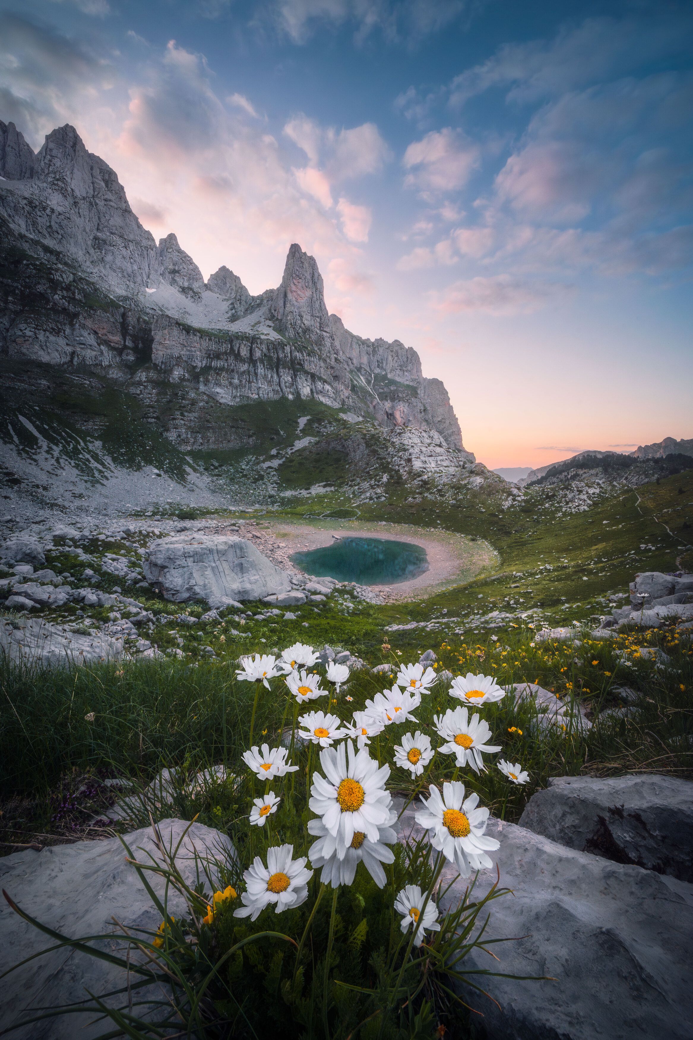 На фоне суровых скал и зеркального озера белые цветы в переднем плане создают контраст нежности и величия. Фотография передаёт гармонию дикой природы в момент, когда день сменяется ночью. Каждый элемент кадра — от тонких лепестков до отражения неба в воде — говорит о безмятежности и вечности гор. Работа Вукотића Николы — это поэзия в формате снимка.