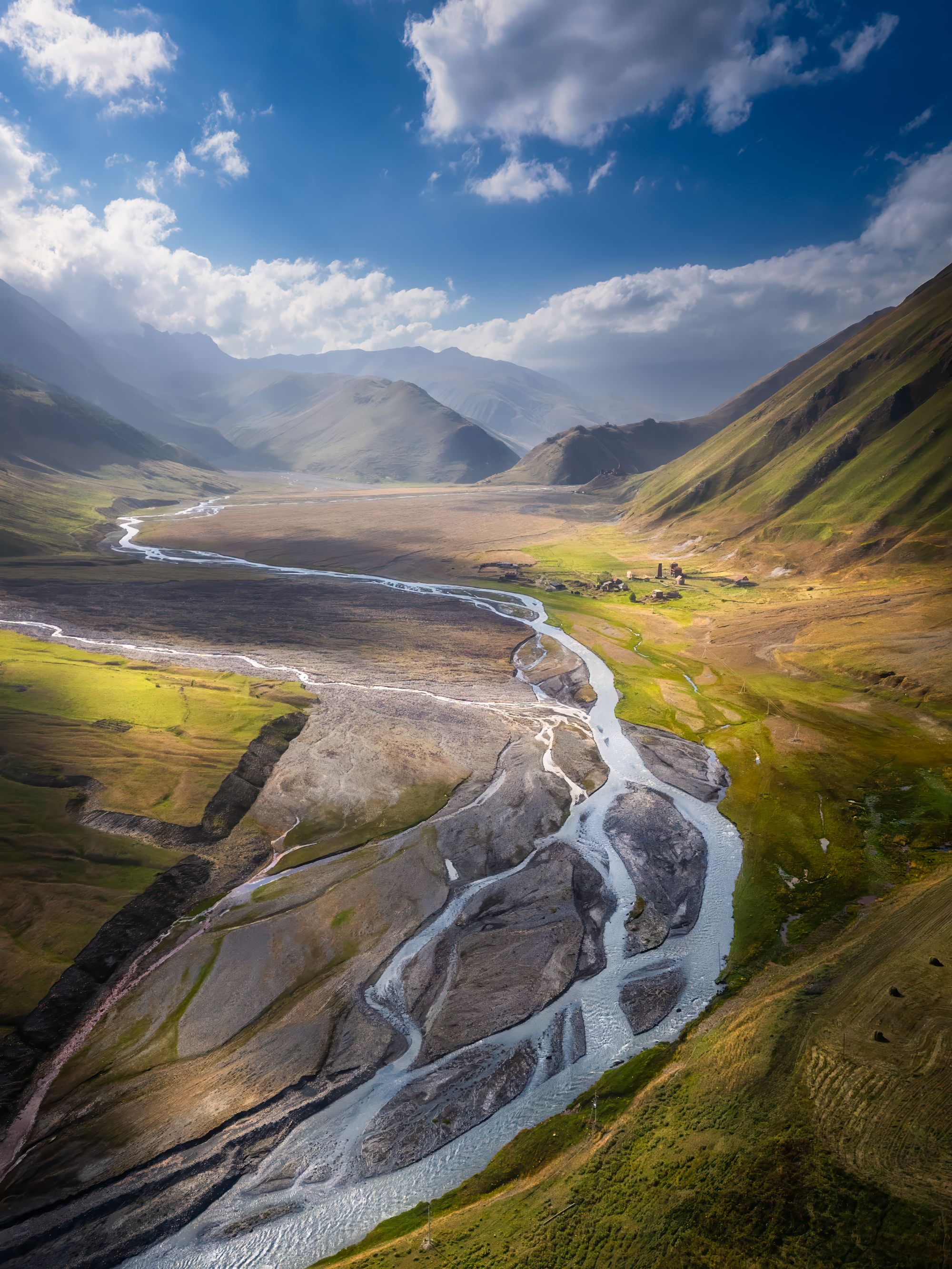 С высоты открывается панорама живописной горной долины, где река, словно серебряная лента, извивается между зелёными склонами и обнажёнными участками русла. Солнечный свет подчёркивает контрасты рельефа, а облака на фоне ярко-голубого неба придают сцене динамику. Фотография передаёт масштаб и спокойствие природы, словно застывшей в моменте. Работа Вукотића Никола.