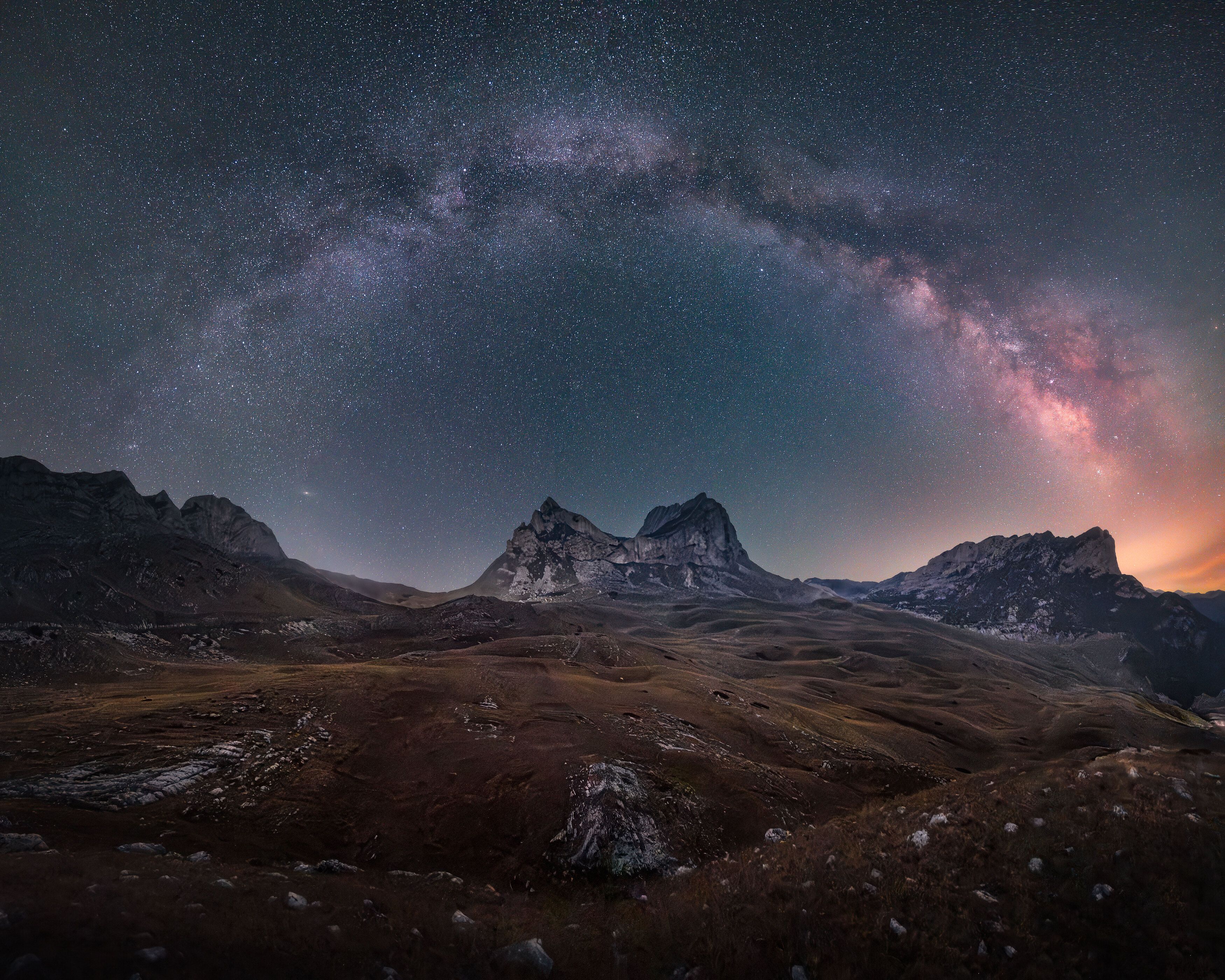 The composition effectively uses the mountain range as a dark anchor against the bright Milky Way. The exposure handles the high contrast well, preserving detail in the stars while keeping the foreground visible. There is a slight gradient of light on the right horizon that adds depth without distracting from the main subject. A solid execution of night landscape photography.