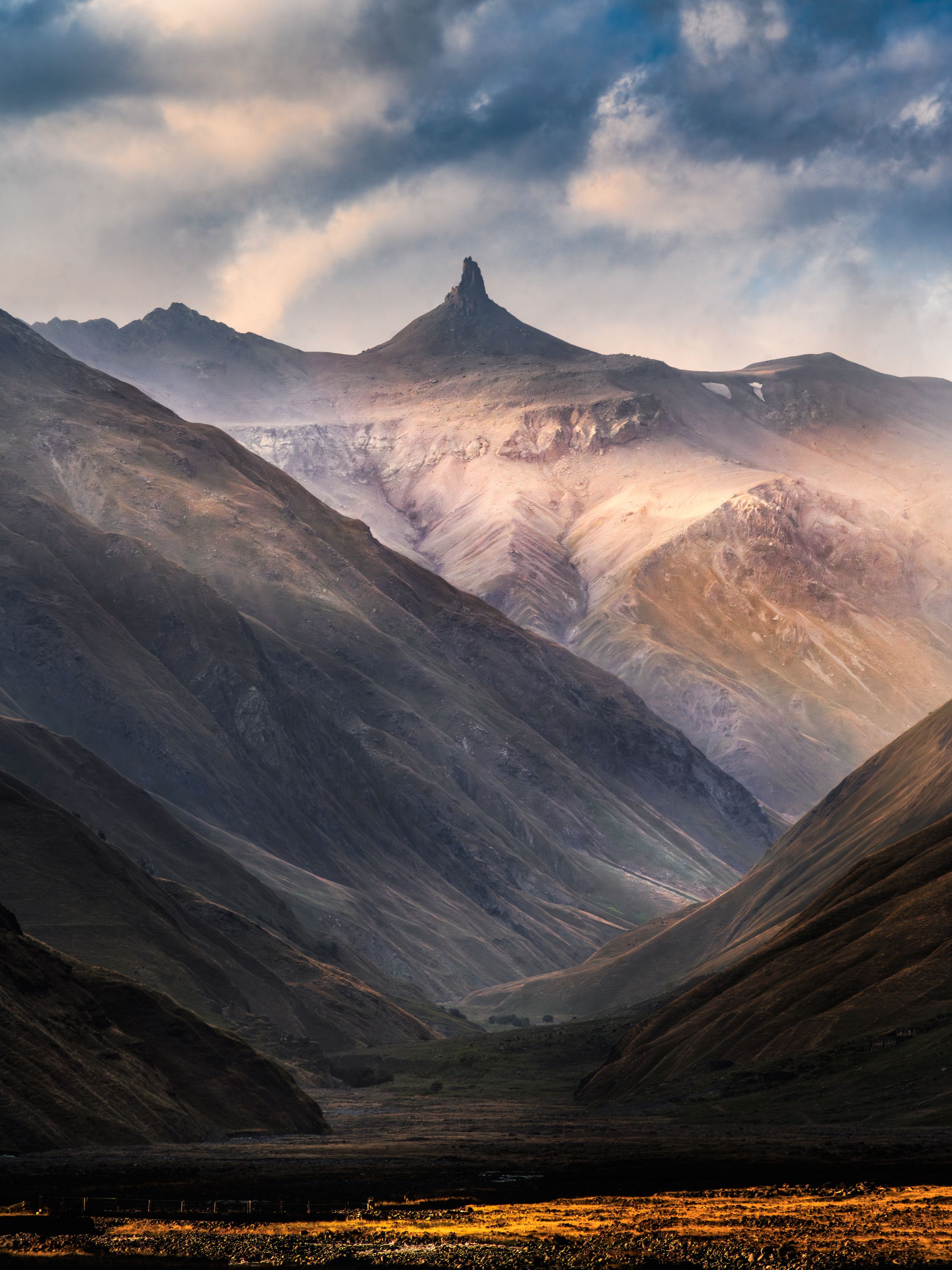 На этом впечатляющем снимке запечатлена мощь горного ландшафта. Величественные пики, покрытые снегом, возвышаются над долиной, уходящей вглубь кадра. Мягкий свет заката окрашивает нижнюю часть сцены в теплые золотистые тона, создавая удивительный контраст с прохладными синими и серыми оттенками горных склонов. Туман, стелющийся среди хребтов, добавляет изображению таинственности и глубины. Работа фотографа Вукотића Николы передает атмосферу спокойствия и величия дикой природы.