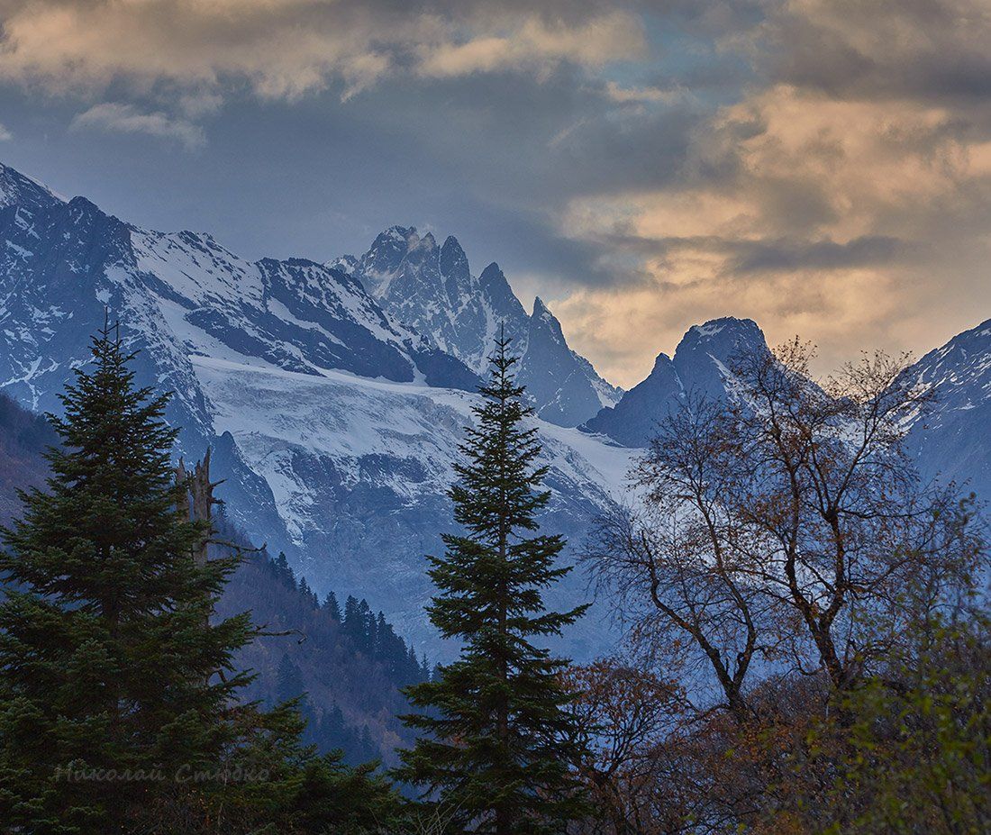 кавказ горы осень деревья закат облака, Николай Стюбко