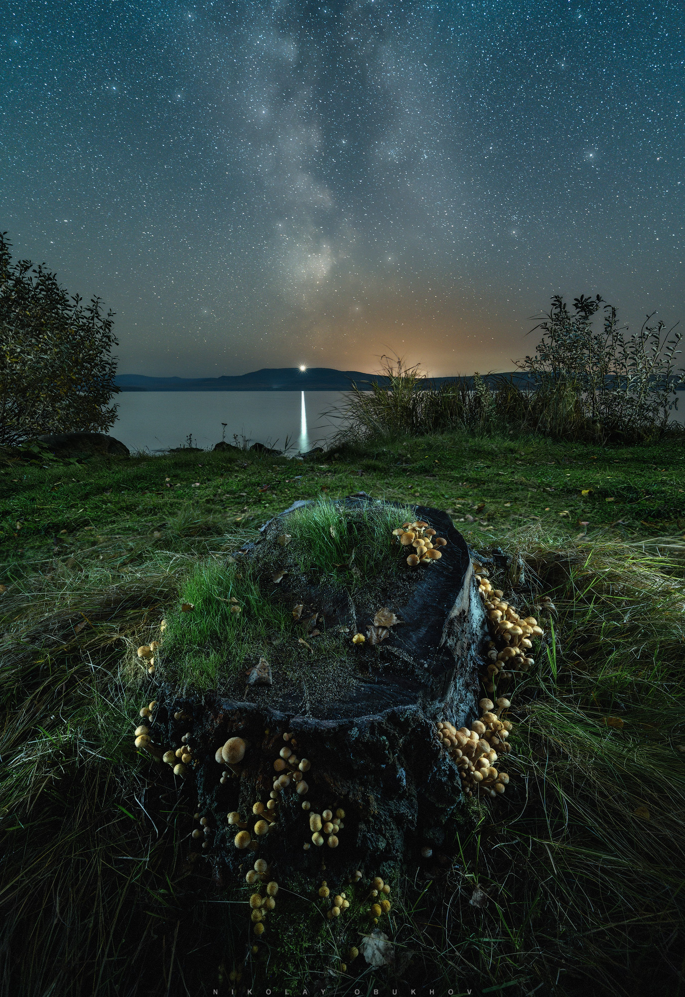 Николай, как всегда — в точку. Ночное небо с Млечным Путем и светящийся столб на горизонте — будто природа сама включила прожектор. А впереди — пень с грибами, будто из сказки, и вся сцена — тихая, но полная жизни.