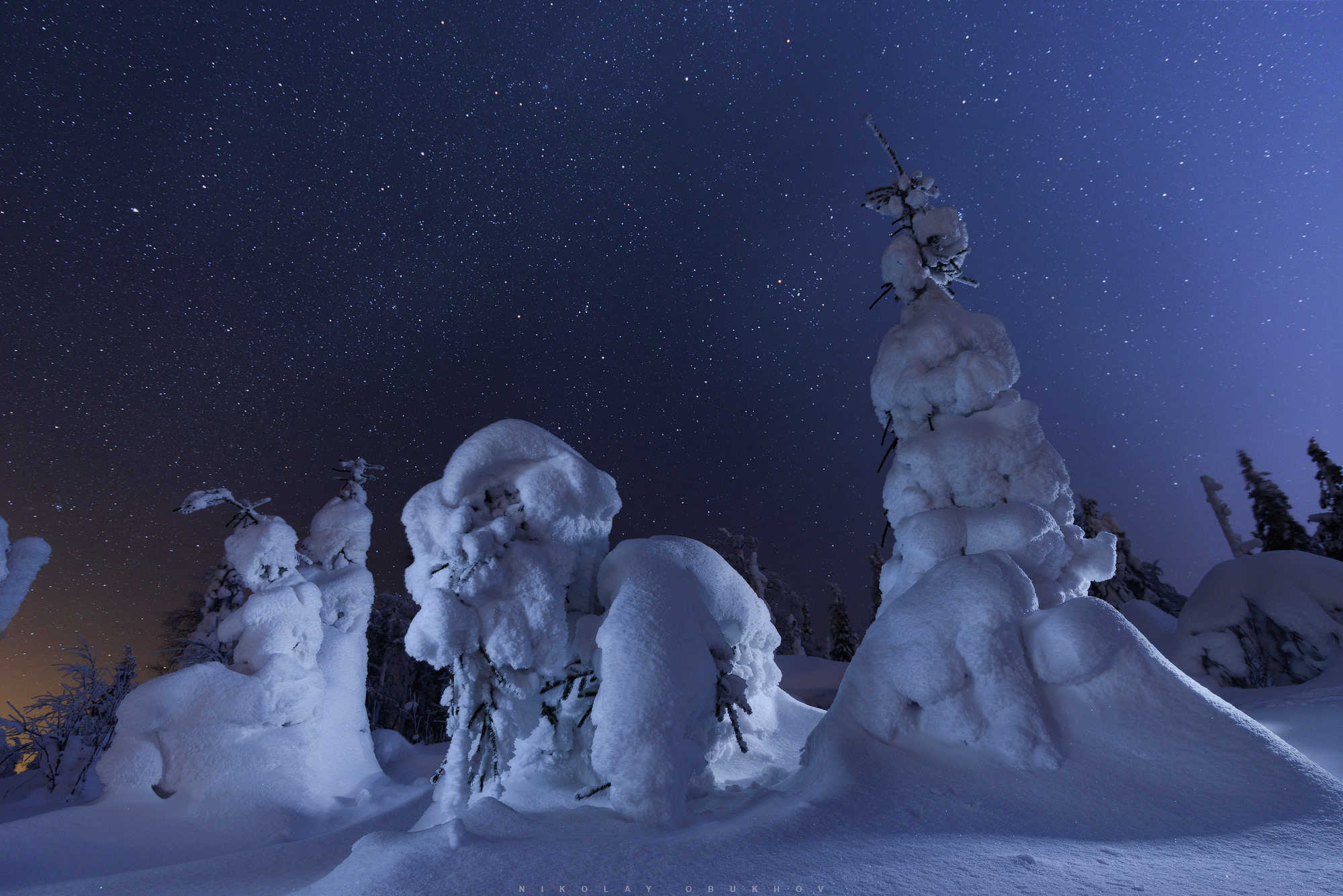 Круто, Николай. Ночь, звёзды, снег — всё как в сказке. Снимок получился атмосферным, с хорошим светом и композицией. Снег на деревьях — будто они застыли в сне.