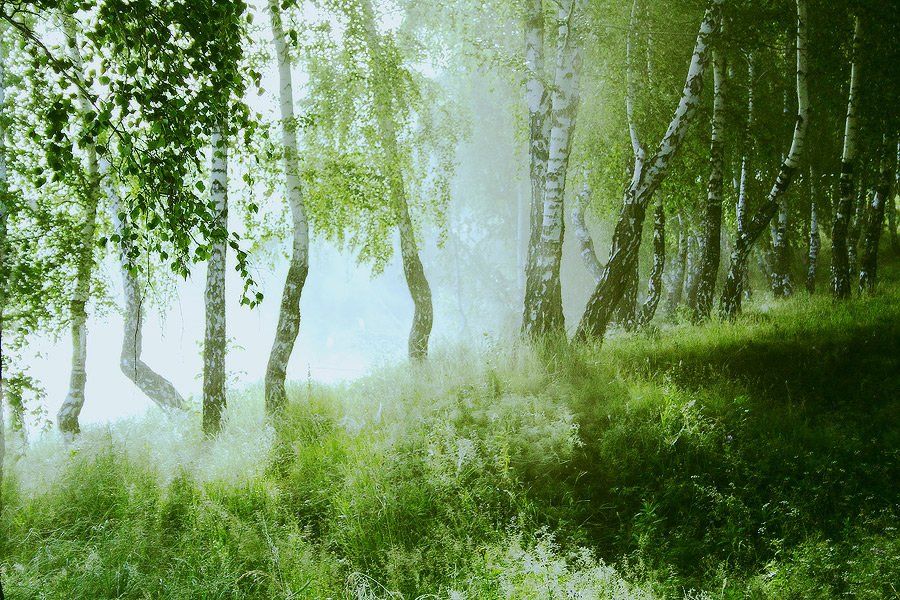 утро, берёзы, туман, Николай Морский