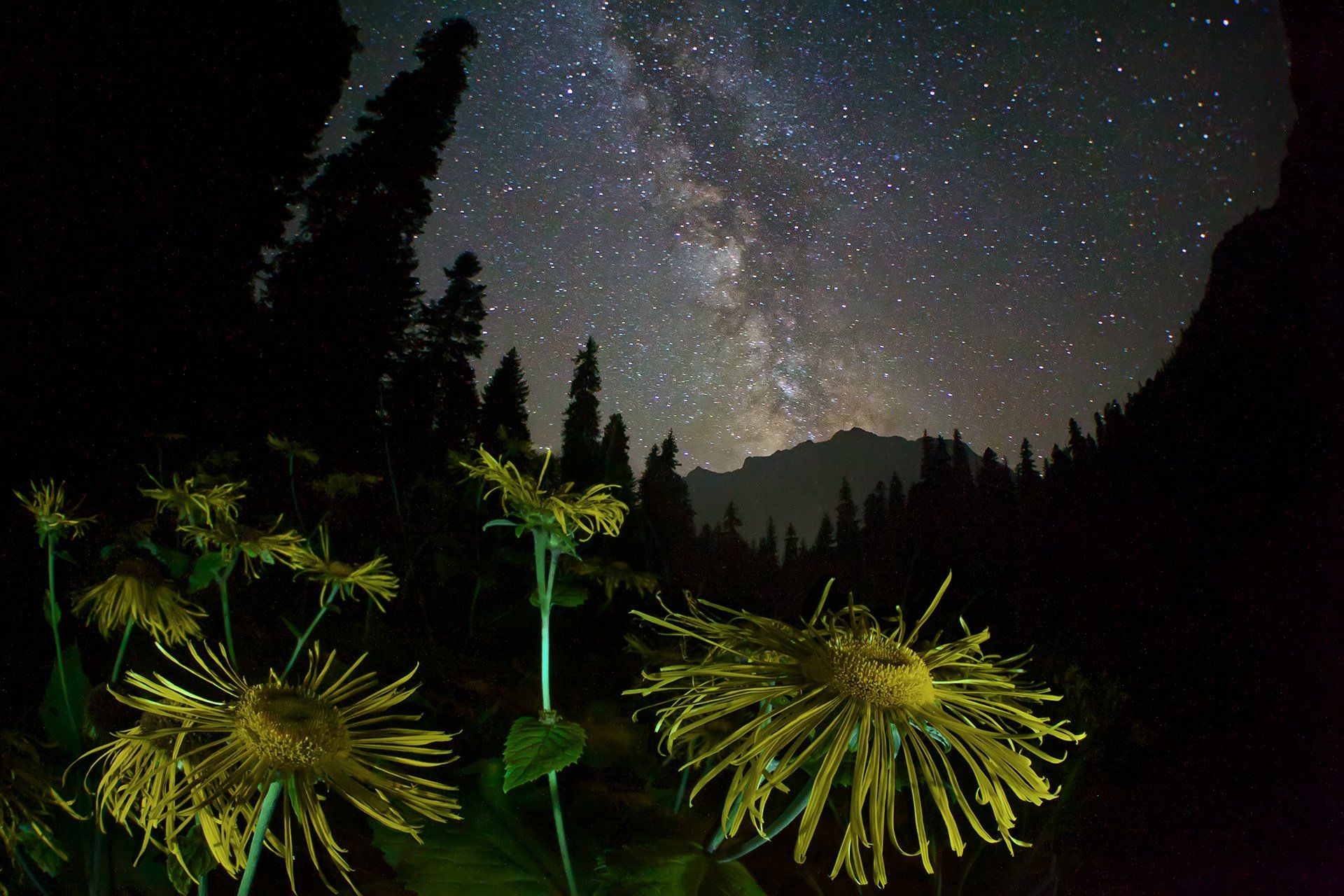 Цветок девясила высокого в ночи очень напоминает солнышко — солнышко под звездным небом. В кадре воплощена идея противопоставления двух миров — микро-мира растений и макро-мира космоса, тепло жизни и холода открытого космоса, живого и мертвого. Данная фотография выполнена одним кадром без мультиэкспозиций, коллажей и прочих достижений цифровой обработки на диагональный фишай.