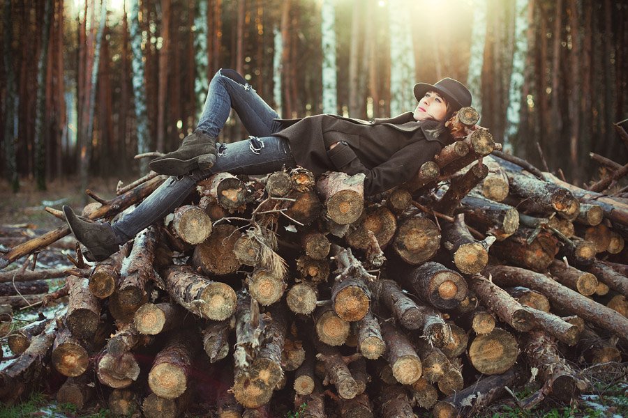 девушка, лес, в лесу, forest line, бревна, деревья, хвоя, портрет, рита, шляпа, лежит, елки, Никита