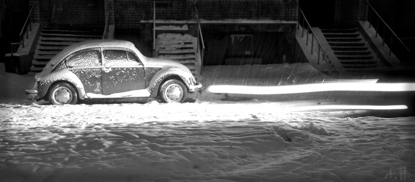 Вспоминаю, и снег был, и ветер, а выдержка 1 секунда, поэтому и штатив, и зонт и ожидание машины навстречу...Такой маленький и романтичный получился "Жук") Спасибо, Денис!