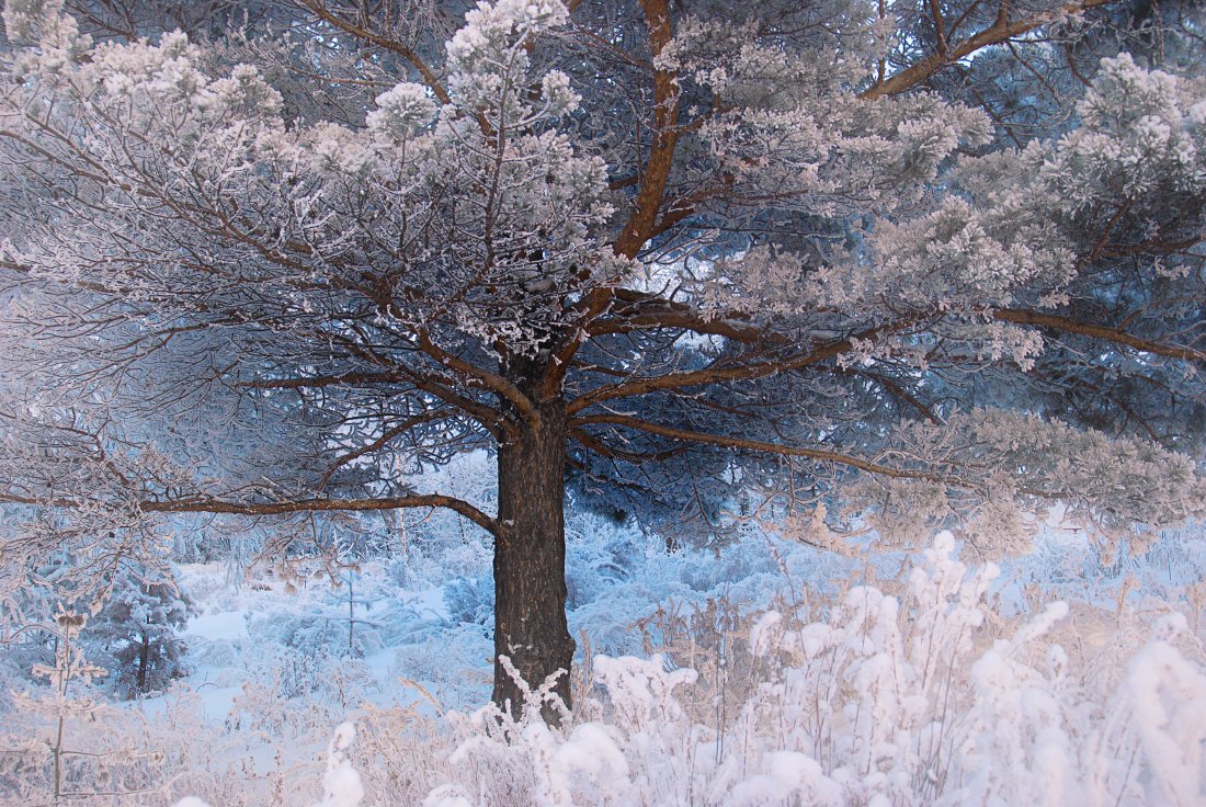 Ветви, Вечер, Вечер Сибирь раскидистое, дерево, Дерево, Заморозки, Зима, Иней, Кедр, Лес, Мороз, Раскидистый, Сибирь, Снег, Трава, Никитин Евгений