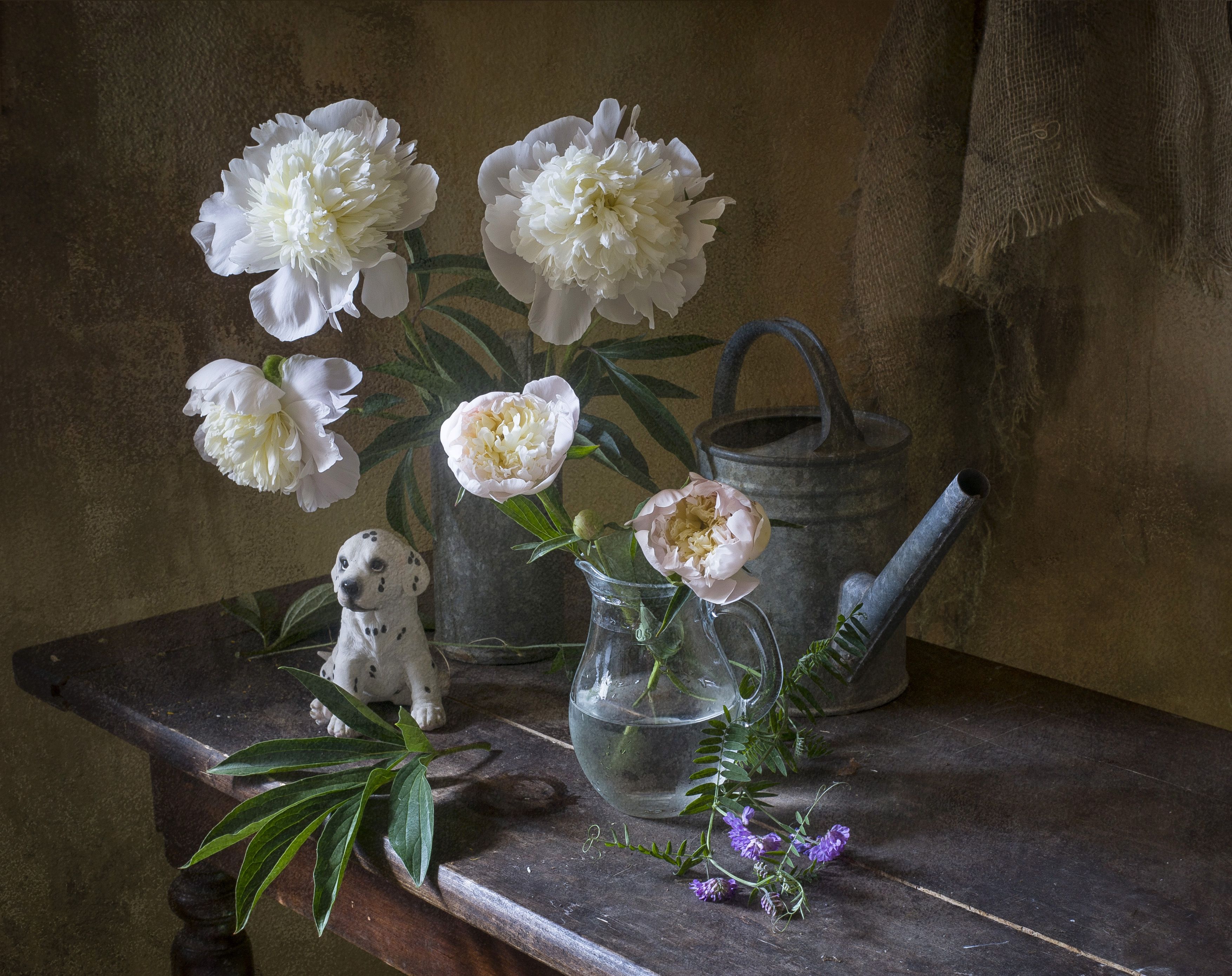 пионы белые, июнь, лейка, мешкковина, Оксана Евкодимова