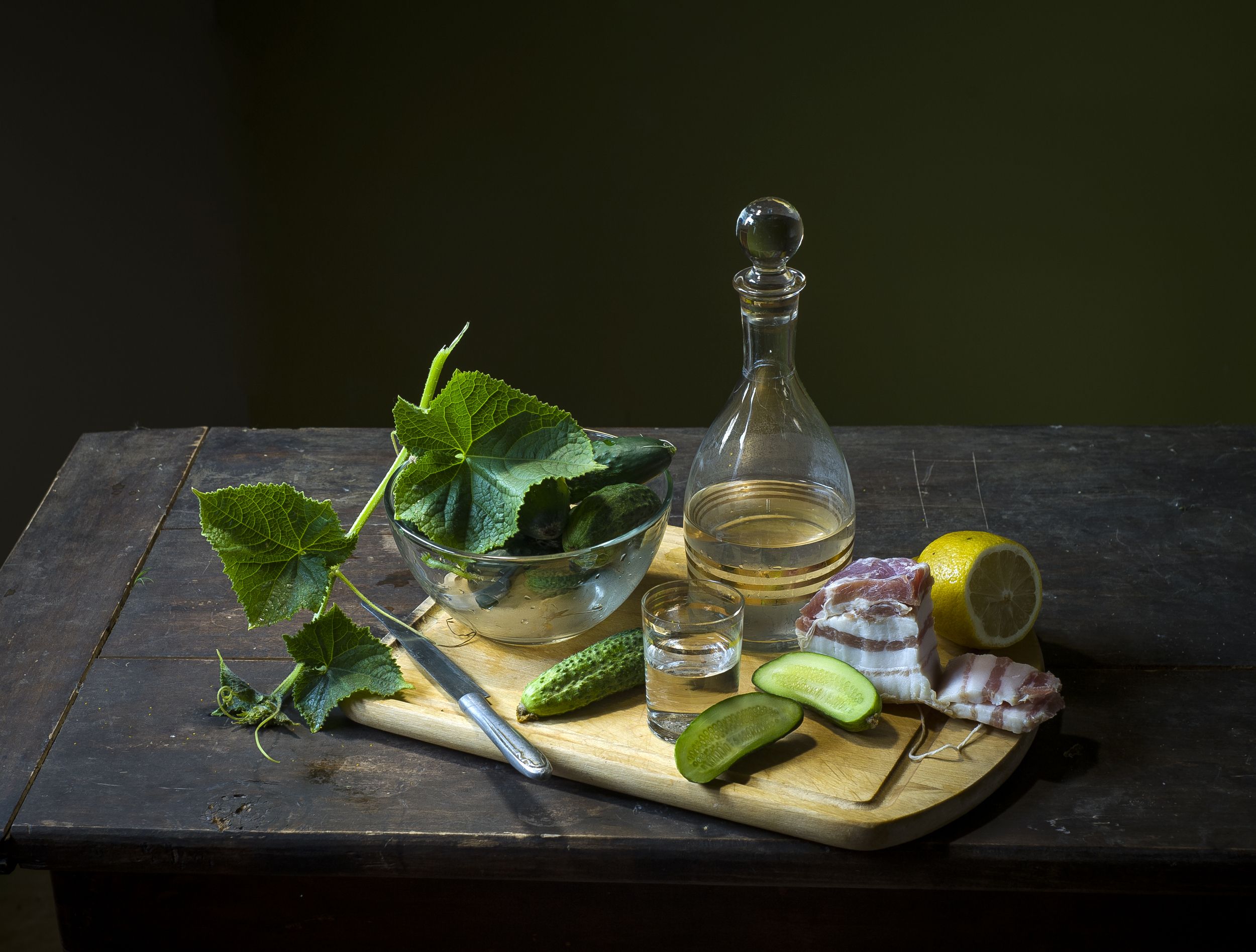 графин, стопка, грудинка, огурцы, лето, лимон., Оксана Евкодимова