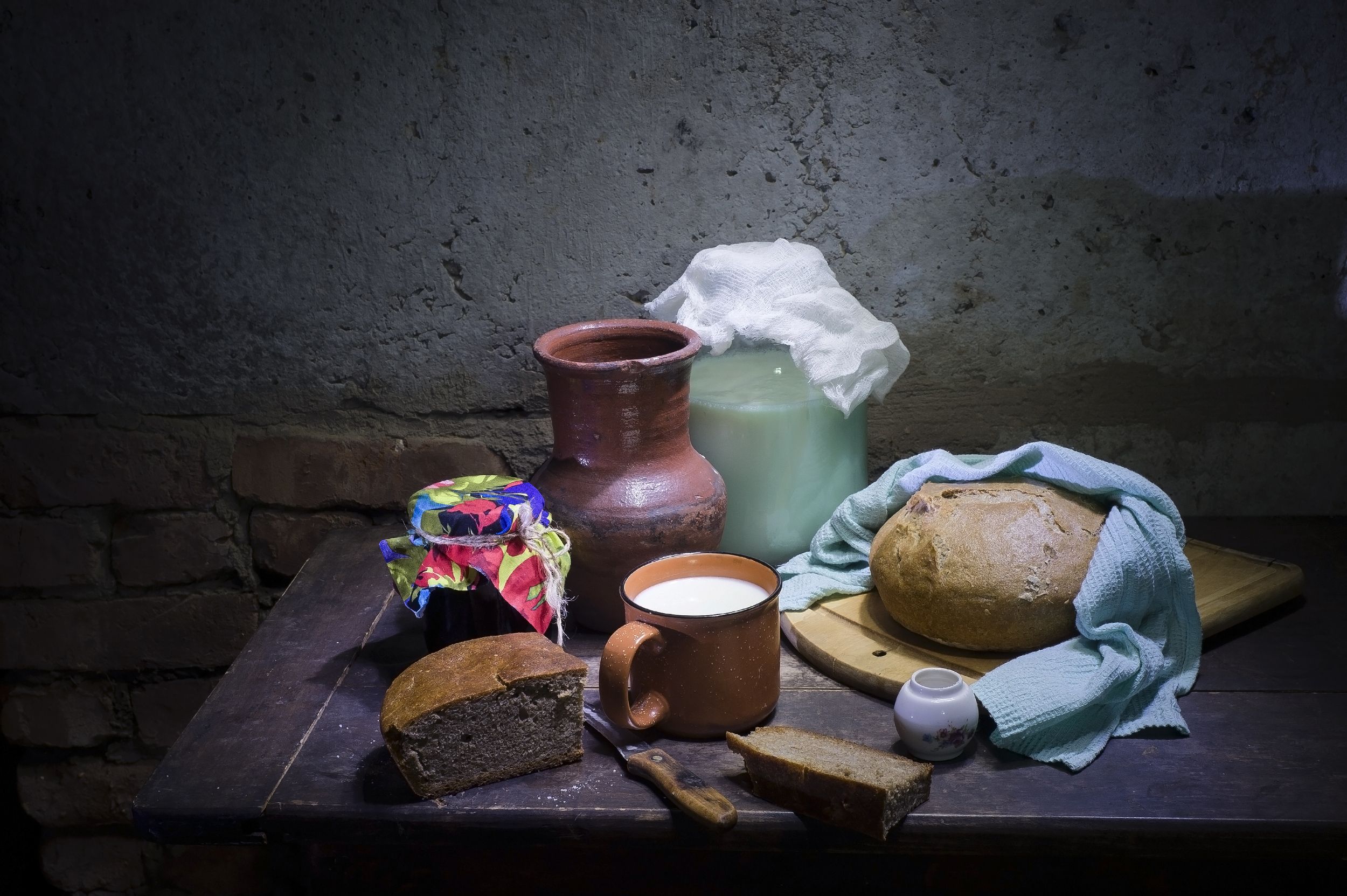 хлеб, молоко, банка, крынка, нож, Оксана Евкодимова