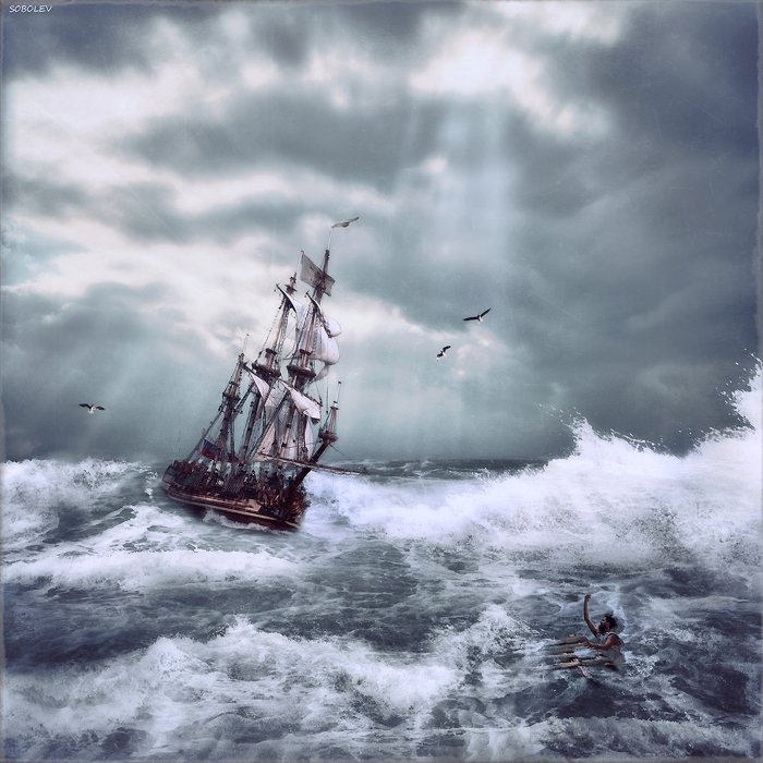Напутано с масштабами-перспективой: чайки зрительно на уровне парусника, но какого же они тогда размера? Метра по три-четыре?